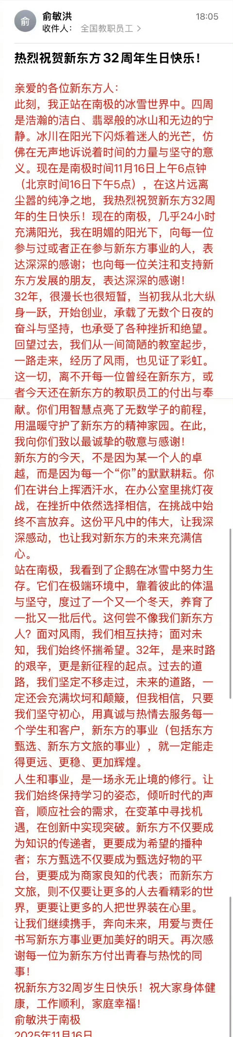 俞敏洪:我刚从南极回来,看到你们说加班辛苦,这次没带你们一起,确实不应该。 员