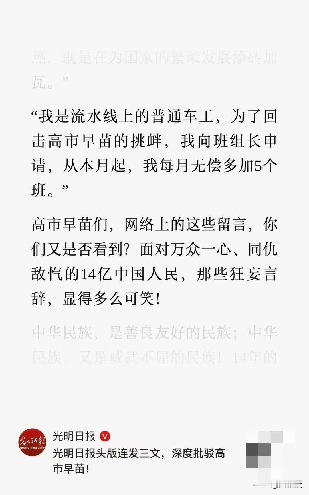 赞👍 光明日报刊文:““我是流水线上的普通车工,为了回击高市早苗的挑衅,我向班组长申请,从本月起,我每月无偿多加5个班。”