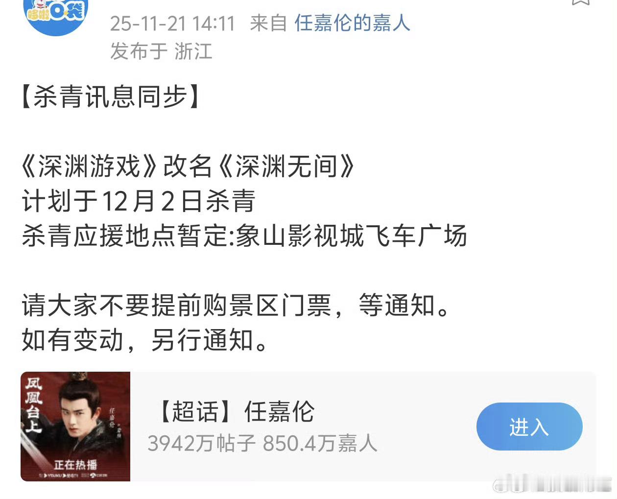 任嘉伦《深渊游戏》改名《深渊无间》,暂定12月2日杀青,速度好快啊