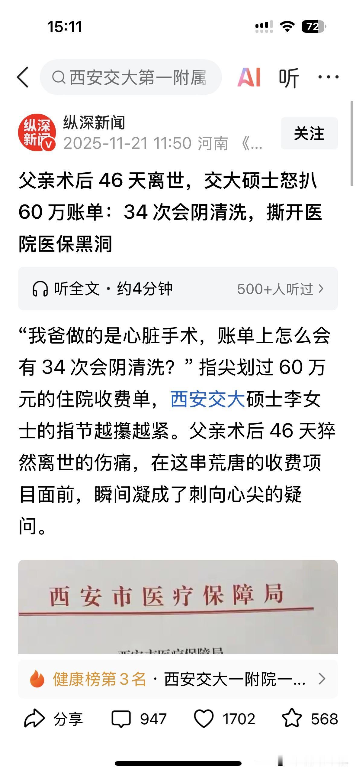 这60万荒唐至极的收费单,男性老年患者心脏病治疗,居然夹杂34次会阴清洗,以及其他不相关费用支出!这不是私营莆田系医院,这是西安交通大学第一附属医院!! 太荒唐了,如今他们连造假都那么傲慢! 陕西省卫健委已回应,称已对涉事医院及医生作出惩处。但李女士更想把自己的教训说给所有人听:“签手术同意书时,别嫌麻烦,每一项都问清楚;核对账单时,别嫌琐碎,每一笔都盯仔细 —— 自己的健康,得自己把牢关。”
