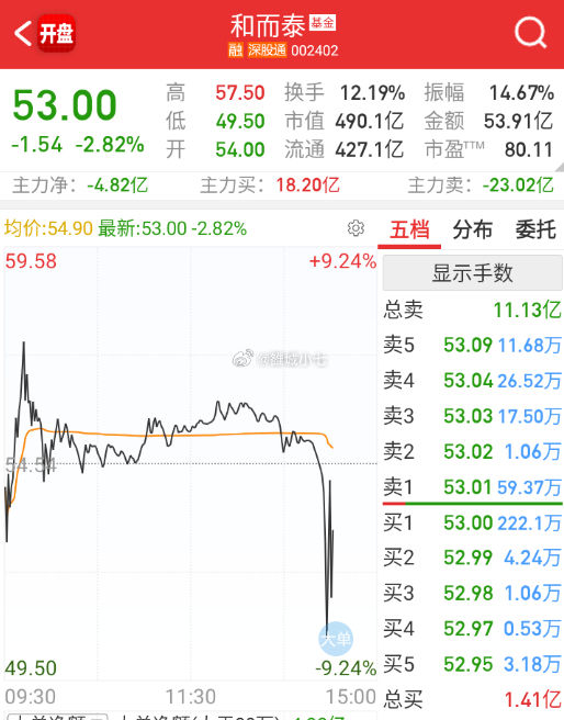 $和而泰 sz002402$ 某路资金蚌埠住,砸了。