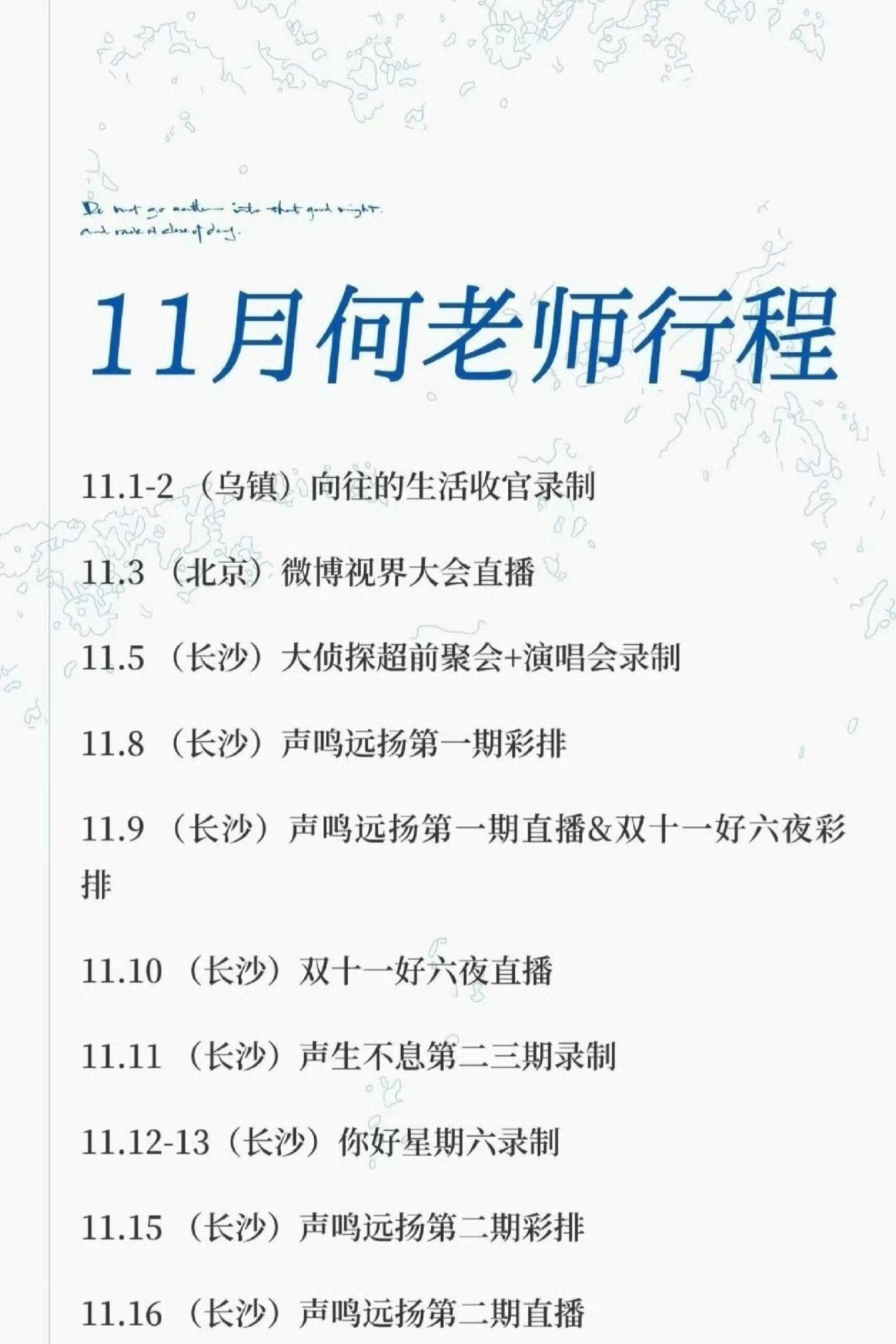 何炅11月行程汇总30天工作22天,也就是休息了8天,相当于我们普通人一个月双休也是休息8天