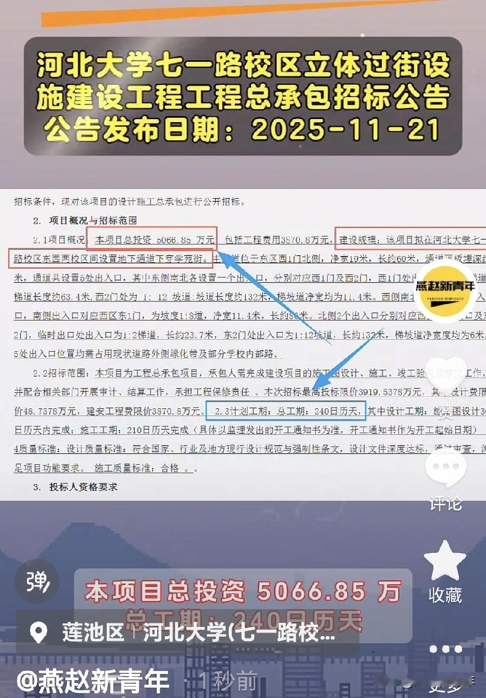 投资5000多万,河北大学七一路校区要建地下通道了,总工期240日历天,下穿学苑街,连通东西两校区… 建设规模:该项目拟在河北大学七一路校区东西两校区间设置地下通道下穿学苑街。主通道位于东区西1门北侧,净宽19米,长约60米,通道顶板埋深约4米,通道共设置5处出入口,其中东侧南北各设置一个出入口,分别对应西1门及西2门,西1门处出入口为 1:2梯道,梯道长度约63.4米,西2门处为 1: 12 坡道:坡道长度约132米,梯坡道净宽均为11.4米。西侧南北共设置3 个出入口,南侧出入口对应西区东1门,为坡度1:8道,净宽11.4米,长约86米。北侧2个出入口分别对应西区临时出口及东2门,临时出口处出入口为1:2梯道,长约23.7米,东2门处出入口为1:12坡道,长约132米,梯坡道净宽度均为6米,5处出入口位置均需占用现状道路外侧绿化带及部分学校内部路。