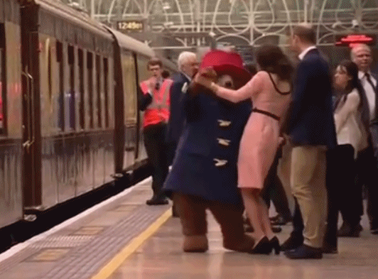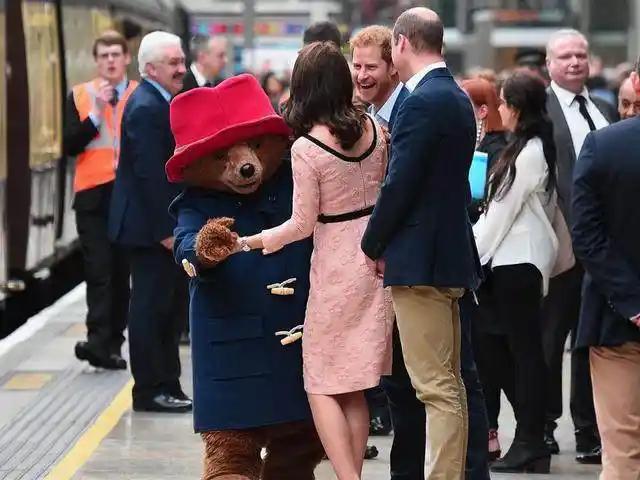 英国王室是帕丁顿熊的忠实粉丝![来看我] 凯特怀着小路易时,与它翩翩起舞, 当时王子兄弟俩都在一起乐呵呵地围观; 女王为了与它下午茶,拍摄了整个下午, 并在白金庆典活动中播放; 如今在音乐厅又遇到它啦[大笑]