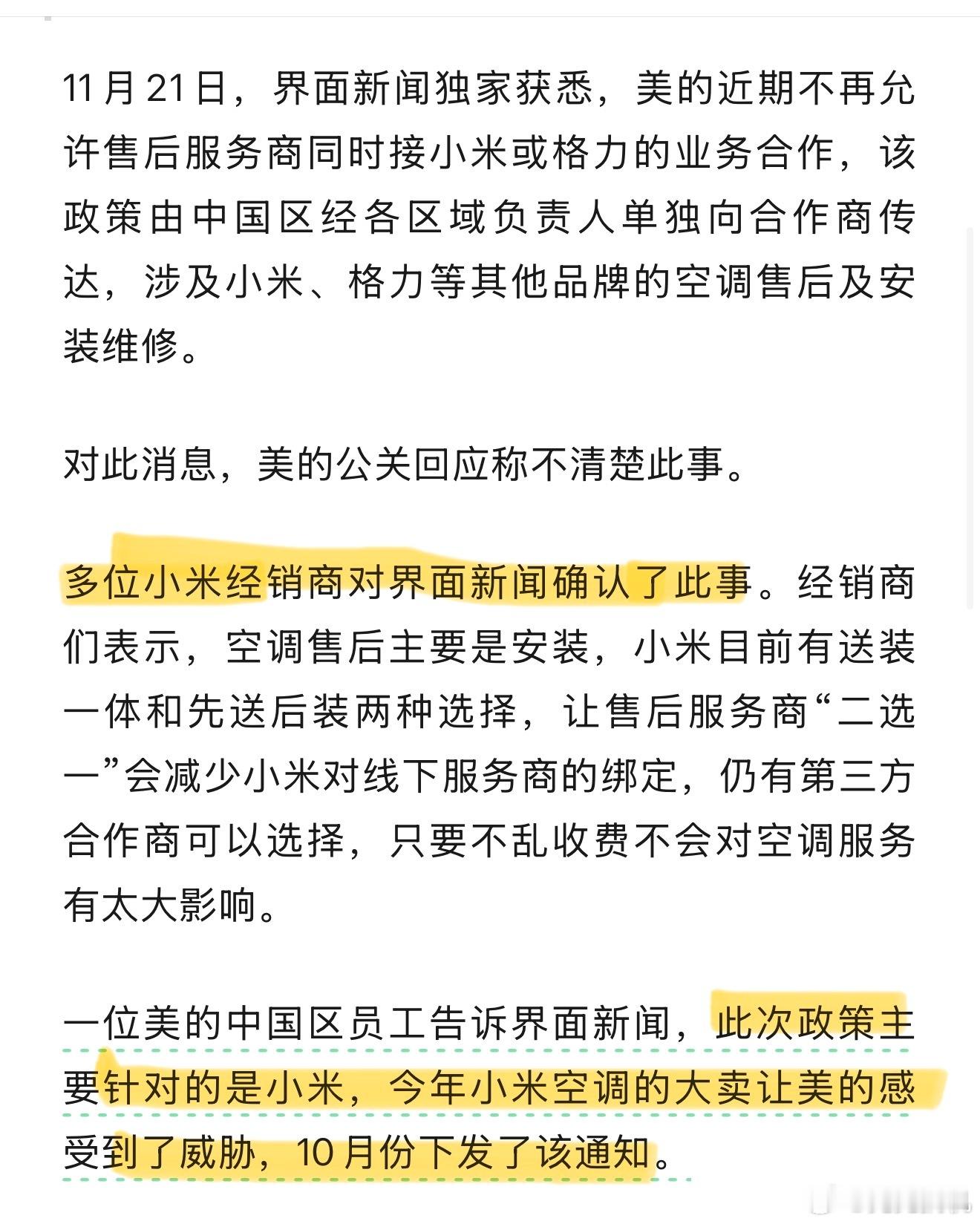 美的针对小米要求售后商不能同时接入小米和格力的业务。对于售后方来说,其实就是麻烦点又要掰开好几个公司来同时做业务了