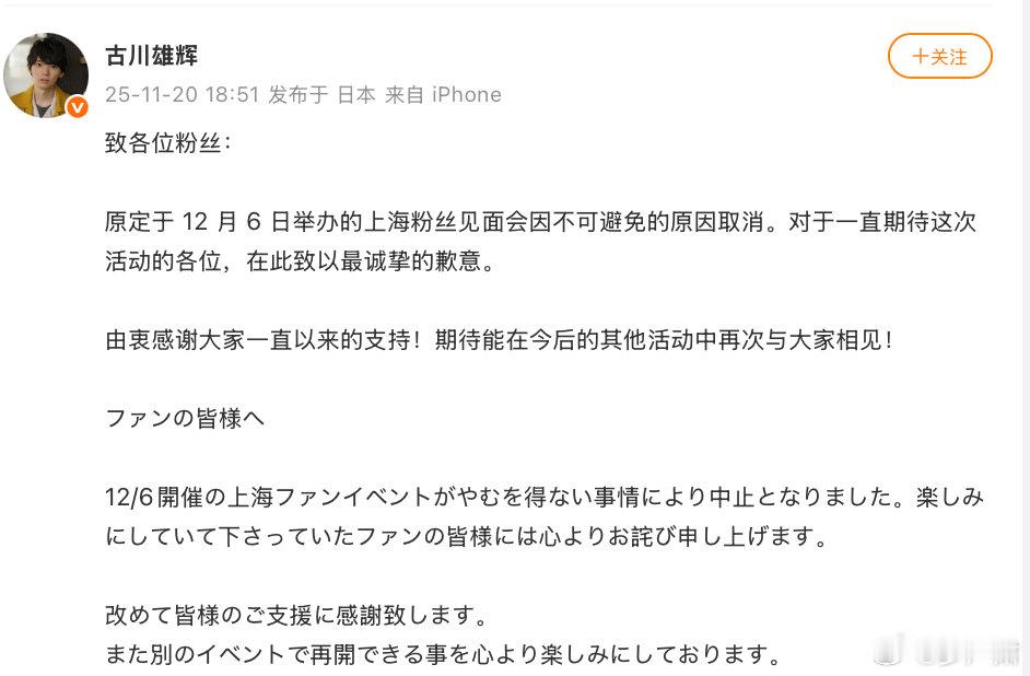 古川雄辉上海粉丝见面会因“不可避免的原因”取消。