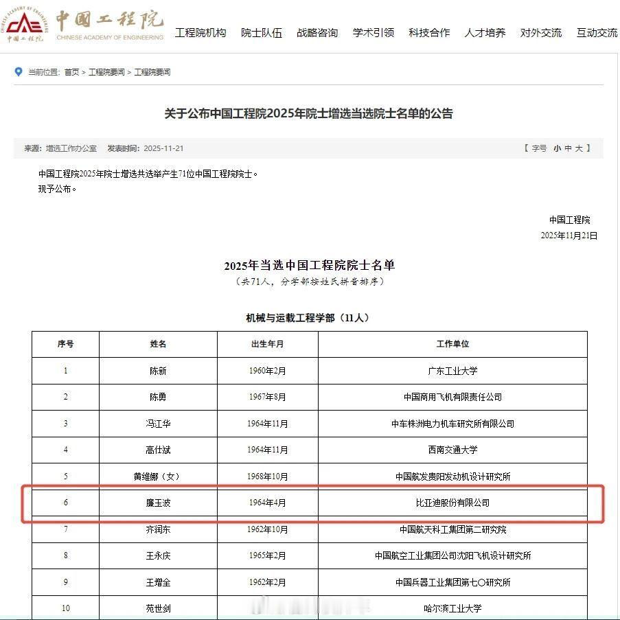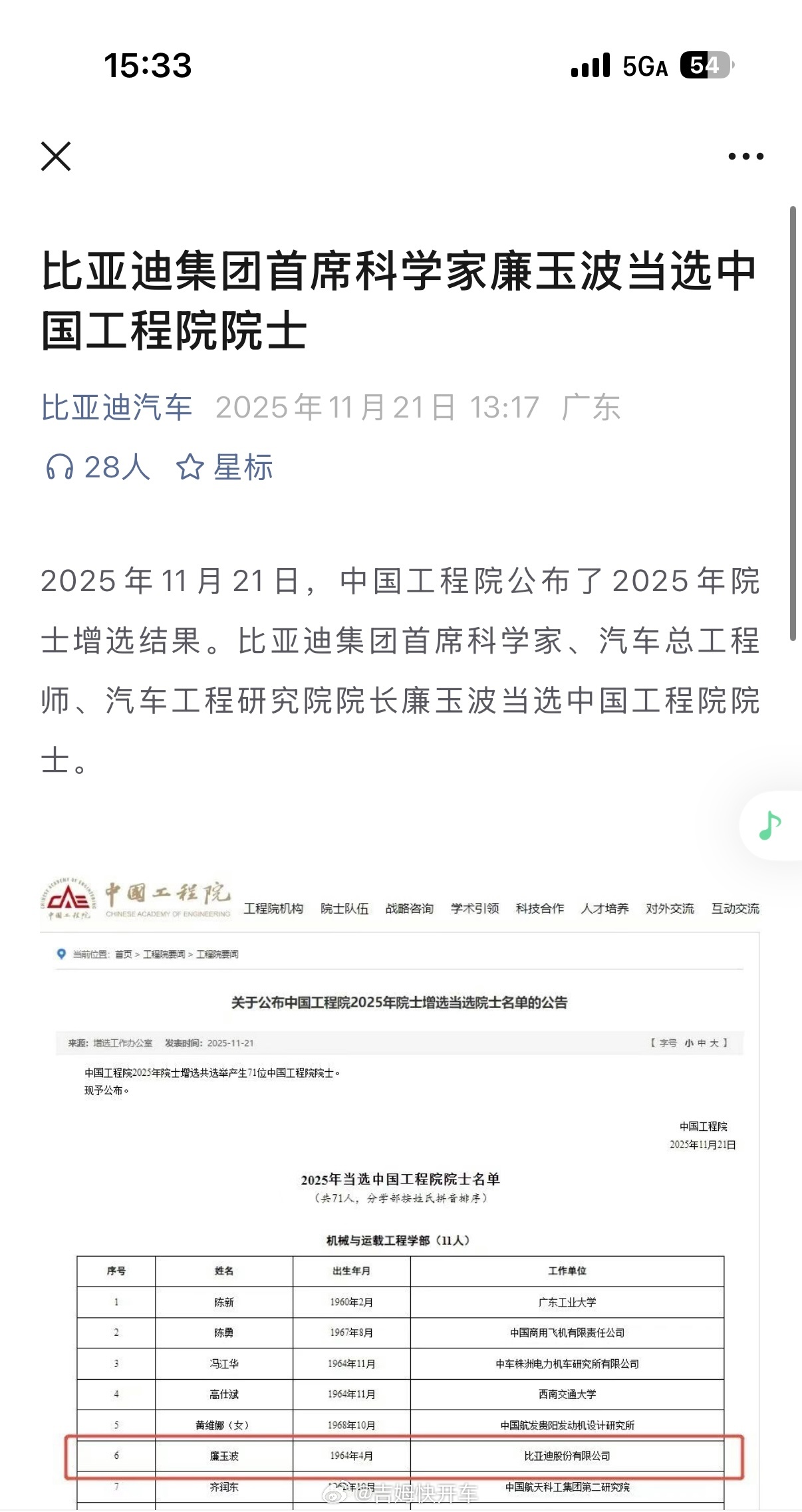 比亚迪集团首席科学家、汽车总工程师,廉玉波先生当选中国工程院院士。民营企业里的工程院院士,这波的含金量有多高就不用多说了