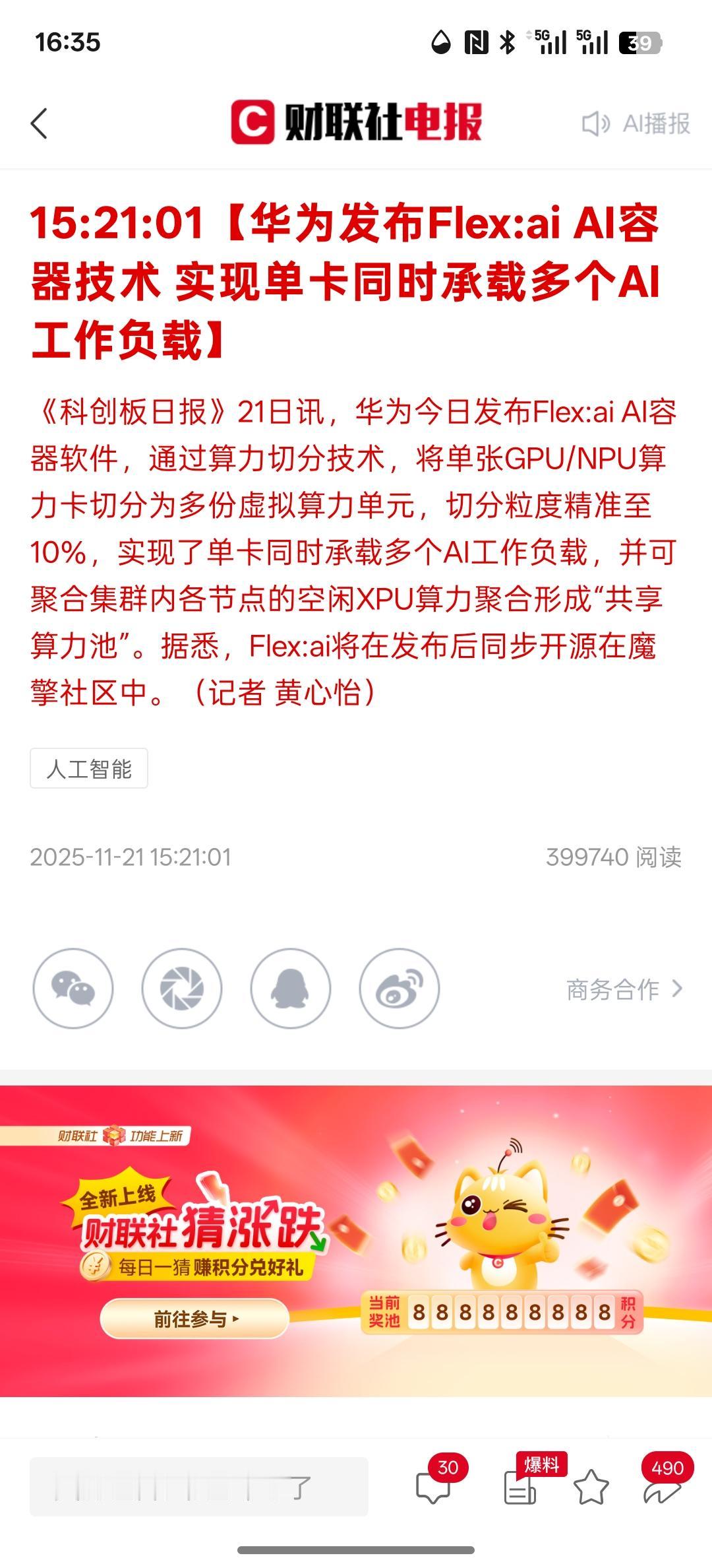 收盘了利好消息,华为发布Flex:ai AI容器技术 实现单卡同时承载多个AI工作负载。那AI容器技术,实现了新的技术突破,那下周可能相关行业板块会有所上涨,GPU相关行业可能会被带动,毕竟这是一个重大的突破技术!Gpu主要是对应AI算力芯片!华为一直在解决中国AI芯片算力卡脖子问题!这一次的技术上的突破,估计会带动行业的发展!可以在AI发展依然是算力芯片还是主要的方向!所以对于下周来看市场,算力芯片行业大概率会走一个反弹!周末期待更多的利好消息,下周一大A也会走出一个反弹走势!