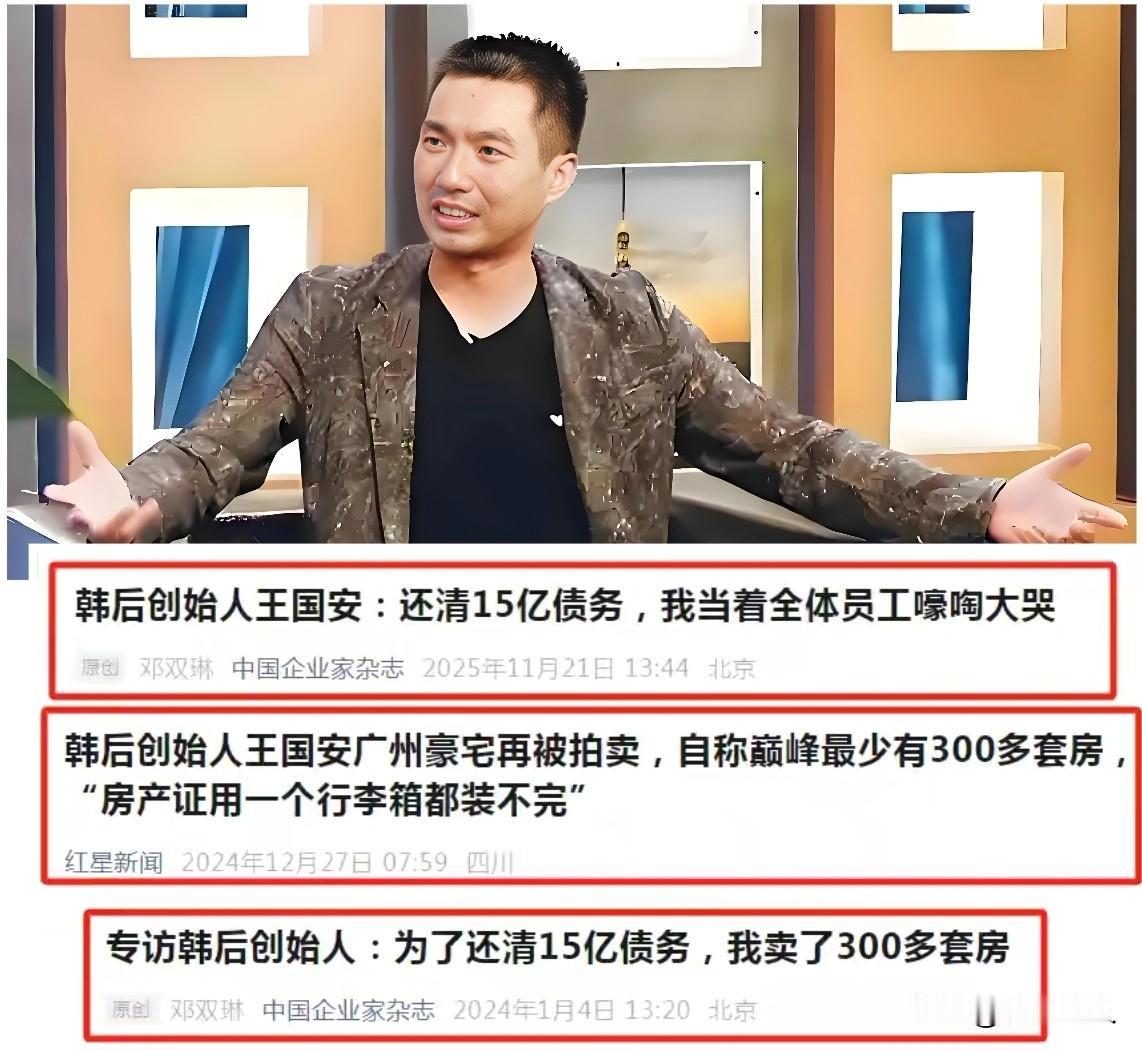 良心老板,卖掉300套房,还清15亿债务 在员工面前崩溃大哭:“我的企业就像我的孩子,一个得了病的孩子,我是最想治好他的人!” 他就是韩后化妆品创始人——王国安 这个在广东商界被称为“王敢敢”的男人,巅峰时期身价数十亿,到负债15亿,微信余额、银行卡也都被封了,再到卖掉300套房,搬到出租房,他带着“王敢敢”IP重新出发,全网粉丝近百万,还清债务,重拾信用,经历了过山车般的人生。 他说:“当老赖不丢人,丢人的是你把烂摊子一扔,没有担当。” 人生浮沉起落,谁都会有低谷期,重要的是跌倒了还能爬起来。 他的故事告诉我们:真正的强者不是不落泪,而是擦干眼泪继续奔跑! (取材:中国企业家杂志)