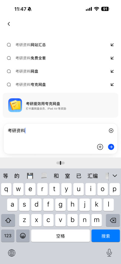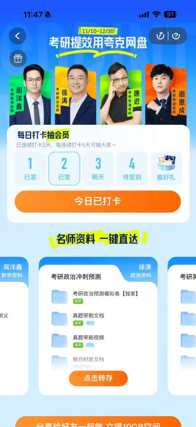 终于知道11月是考研质变期!夸克网盘冲刺打卡活动同步开启,iPad、AirPods、会员等你抽,把精力留给学习,冲刺的密度决定上岸的高度。