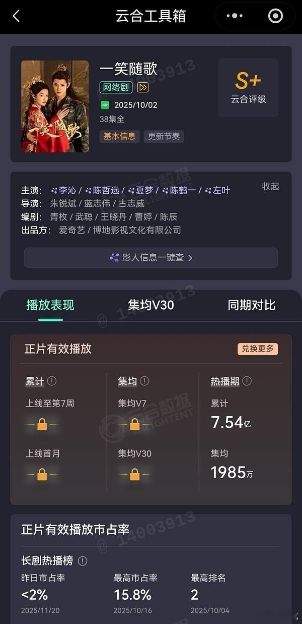 11.20云合估算:要跌破1.6了,根据年榜变动,唐诡目前估值挺稳合的,11月误