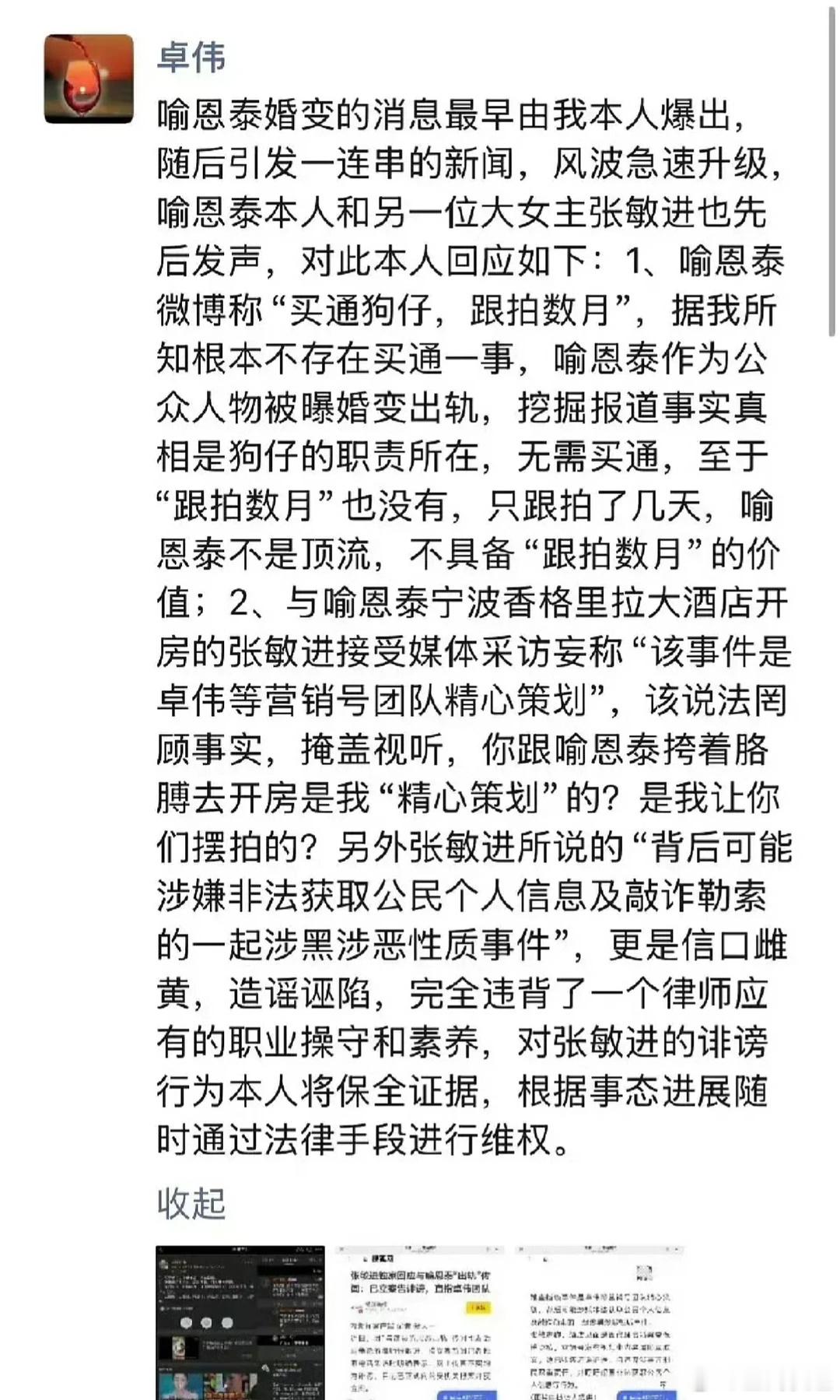 卓伟回应喻恩泰婚变一事:“不存在买通狗仔一事,挖掘报道事情真相是狗仔职责所在。”“跟拍数月也没有,只跟拍了几天,喻恩泰也不是顶流,不具备跟拍数月的价值”