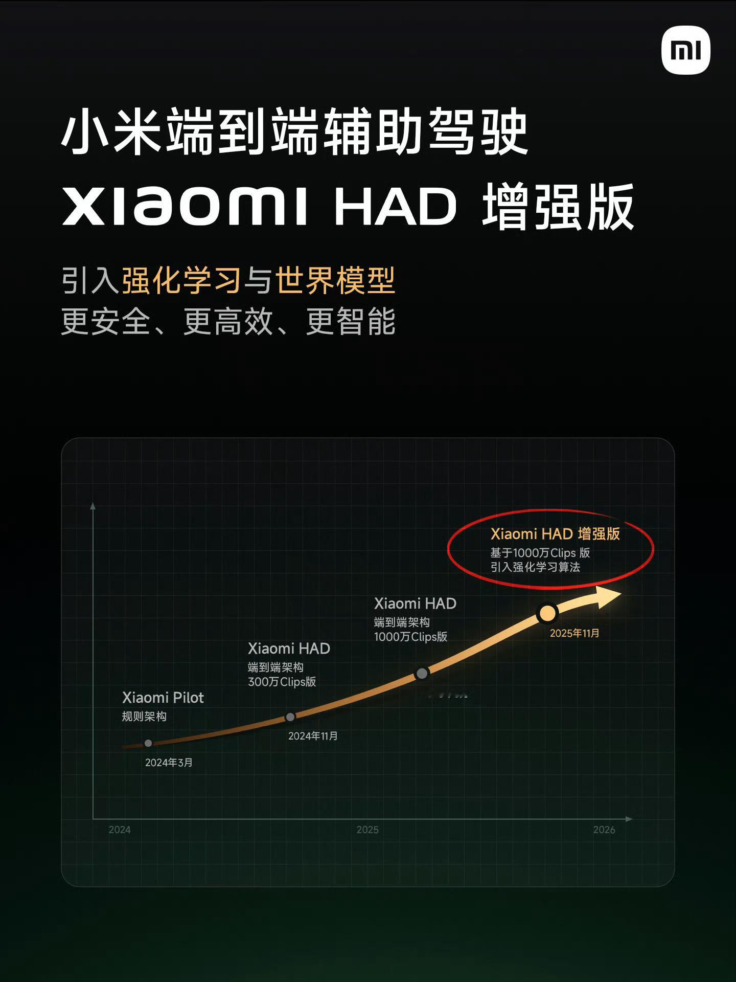 小米今天在广州车展发布了小米端到端辅助驾驶「Xiaomi HAD 增强版辅助」它主要引入了强化学习和世界模型,并且提升了横向和纵向的体验以及路况的理解能力。小米的辅助驾驶迭代速度还是很快的,但是新版本辅助驾驶的能力相比于目前的第一梯队应该还是有不少差距。不过小米的决心还是很坚定的,在辅助驾驶初期就投入了 57.9 亿,期待小米能把辅助驾驶做好。