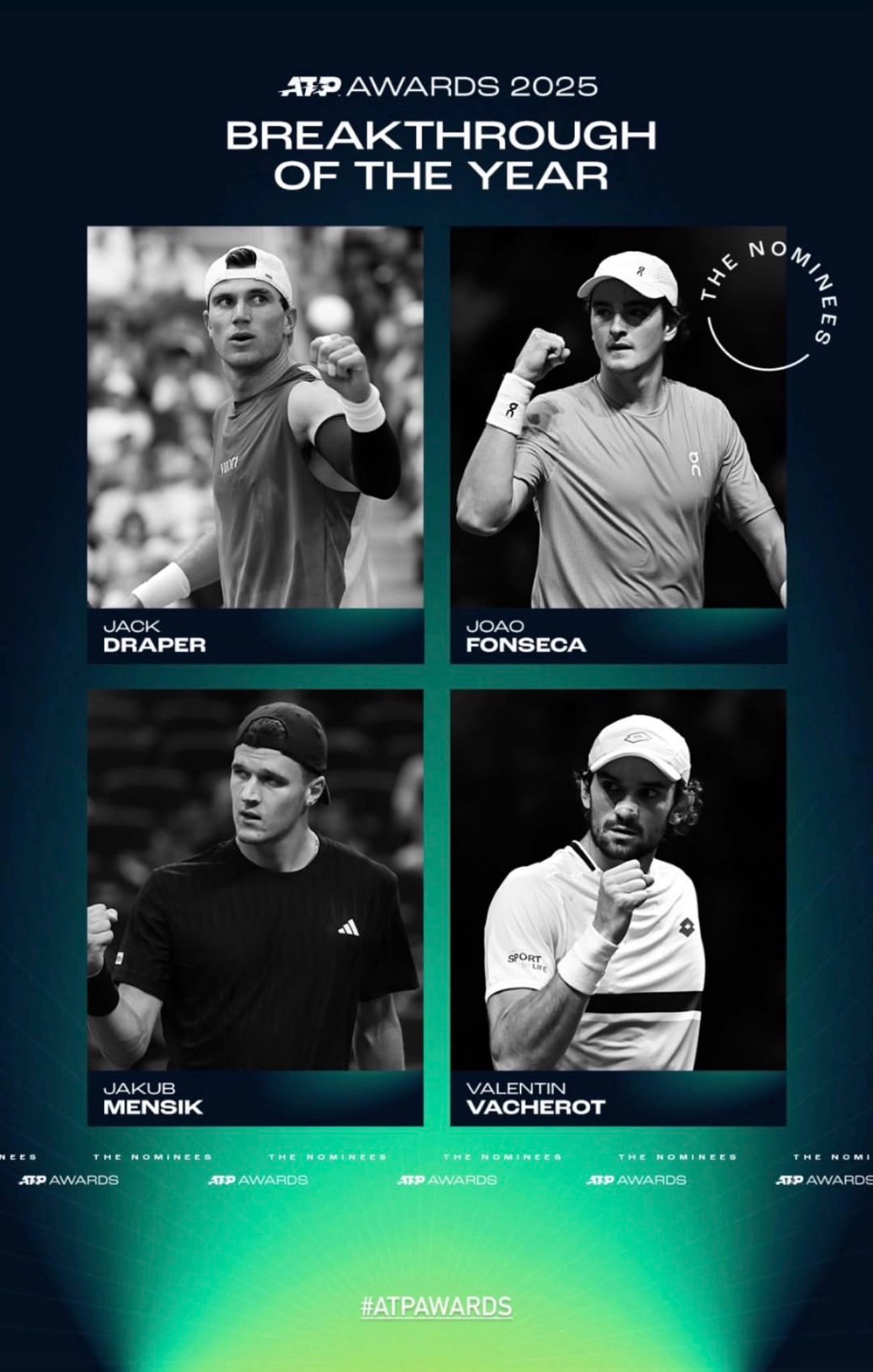 2025ATP年度奖项候选:年度突破球员:德雷珀丰塞卡门希克瓦舍罗年度最佳教练:卡希尔& 瓦格诺兹(辛纳)费雷罗&塞缪尔·洛佩兹(阿尔卡拉斯)巴勒雷(瓦舍罗)冯唐(阿利亚西姆)布莱恩·谢尔顿(本·谢尔顿)斯蒂芬·埃德伯格体育风尚大奖:阿尔卡拉斯阿利亚西姆迪米特洛夫鲁德