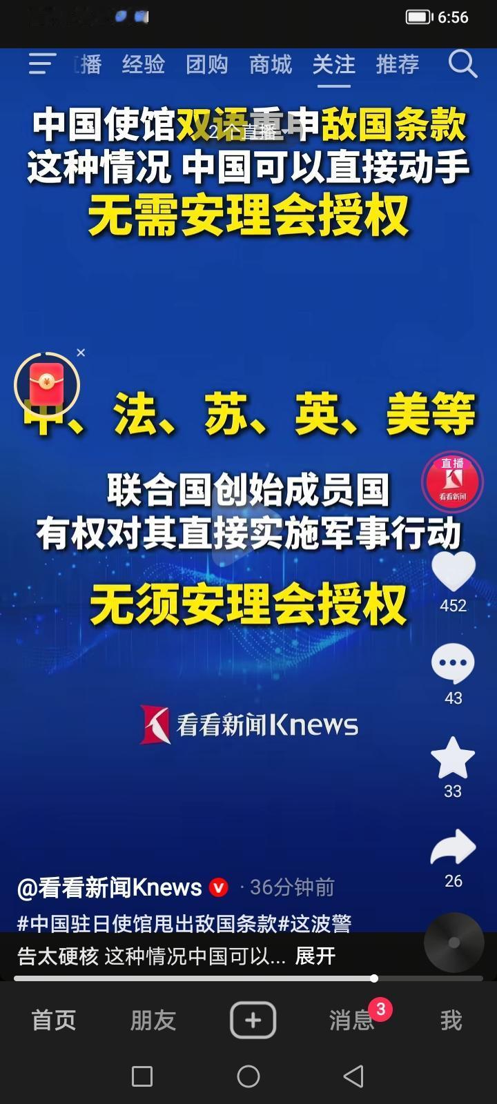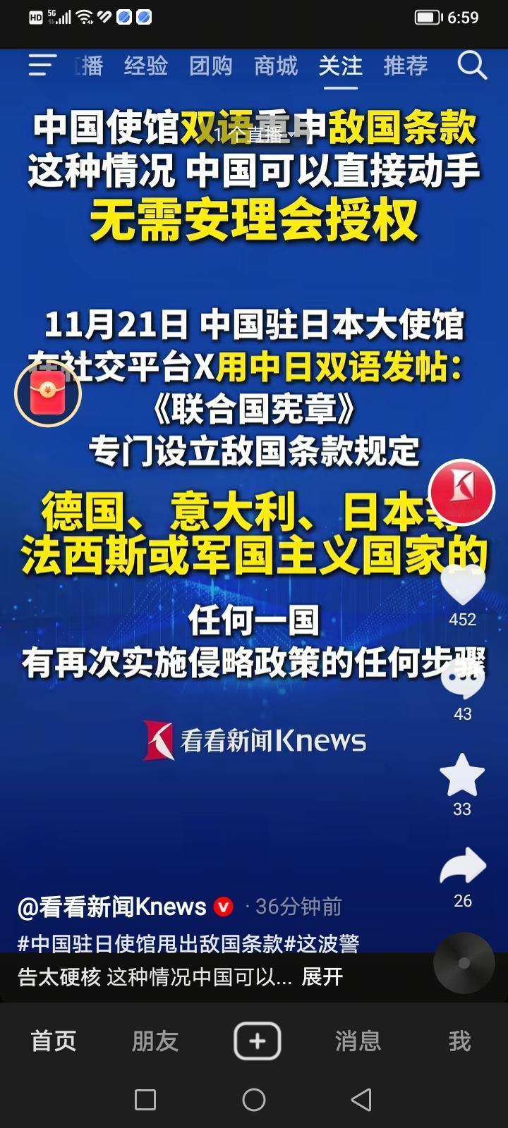 2025年11月21日,中国驻日本大使馆在社交平台X以中日双语发声,重申了《联合国宪章》中的“敌国条款” 。该条款明确若日本等曾实施法西斯或军国主义的国家再次推行侵略政策,中、法、苏(现为俄罗斯)、英、美等联合国创始成员国,有权直接对其采取军事行动且无需经过联合国安理会授权。 “敌国条款”由《联合国宪章》第53条、第77条、第107条共同构成。其中核心的第107条作为过渡性安全条款,是战胜国处置再次发动侵略的战败国的核心法律支撑,也是此次中方重申内容的核心法理依据。这一条款并无失效期限,只要日本未彻底清算军国主义历史、仍有侵略风险,条款就始终具备效力。中方此次重申,是针对日本近年持续增加国防预算、政客参拜靖国神社、宣称“台湾有事即日本有事”等触碰战后秩序红线的举动作出的法理预警,以此守护二战后建立的国际和平秩序。(图片信息来源:看看新闻Knews中方正告日本 日本对外政策 中方对日本态度 日本外交礼仪 中日四个文件 联合国宪章