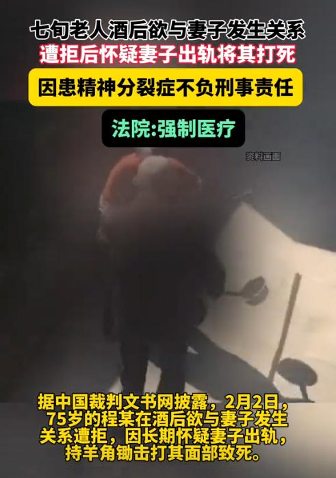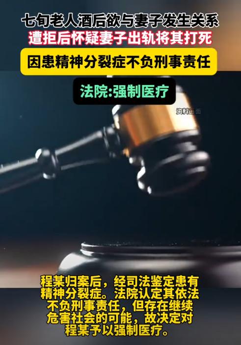 陕西岚皋,一位75岁老汉酒后打算和妻子发生关系被拒,怀疑妻子和邻居老谭有染,竟趁妻子入睡时持羊角锄捶打妻子头部致其死亡。老汉的子女建议对老汉做下精神能力鉴定,结果显示老汉患有精神分裂症,无刑事责任能力。(来源:岚皋县人民法院) 据悉,老汉程某自从和妻子张某分床睡后,夫妻的感情越来越差。尤其是张某和男邻居谭某总是有说有笑的,让程某的内心嫉妒感更甚。 2025年2月2日晚上,程某到兄弟家吃饭,期间喝了点酒,当晚9点多才回了家。在晚上11点多的时候,程某看到张某去上了个厕所,然后回到了自己的房间,顿时来了兴致。 程某推开张某的房间门口,直接爬上了床,想要和张某发生关系。虽然程某和张某年龄也不小了,但毕竟是正式夫妻,所以程某想和张某发生关系也十分正常。 然而张某却一点面子都不给,直接将程某推下了床,还指责程某老不正经。程某刚升起的欲望被瞬间浇灭,气得当场摔门而出。 回到房间的程某越想越气,他又想到了平日里张某和谭某热情聊天的模样,于是来到后院找了把羊角锄,再次回到张某的房间。 在确定张某已经睡着后,程某便用羊角锄猛砸张某的面部10多下,随后将羊角锄放回原处,回自己房间睡觉去了。 中途程某去张某的房间看了一眼,发现张某好像没了气息,但他并没有报警,而是又回到自己房间睡觉了。 次日早上7点多,儿子进入张某的房间寻找钥匙,结果发现张某满脸是血迹,且已经没了气息。 后村干部选择了报警,警方很快就调查到是程某所为,于是对其进行了审讯,程某对自己的行为也没有任何的隐瞒。 经过鉴定,张某的死因是被钝性物体多次击打头、面部,导致重度颅脑损伤死亡,与程某的行为具有因果关系。 然而就在警方侦查期间,程某的子女突然提出要给程某做精神能力鉴定,他们怀疑程某精神不正常。后经司法鉴定,程某的确患有精神分裂症,且在案发时处于无刑事责任能力状态。 《刑法》第18条规定,精神病人在不能辨认或者不能控制自己行为的时候造成危害结果,经法定程序鉴定确认的,不负刑事责任,但是应当责令他的家属或者监护人严加看管和医疗;在必要的时候,由政府强制医疗。 有不少人认为,程某在案发前还准备和张某发生关系,这是一个精神分裂症的人能做出的事?我不太相信。 还有网友表示,即便程某没有精神分裂症,他这个年龄也不会受到刑事处罚,警方正好也不想管。 其实从法律上来讲,程某的年龄并不是他逃避刑责的理由。 《刑法》第17条之一规定,已满75周岁的人故意犯罪的,可以从轻或者减轻处罚;过失犯罪的,应当从轻或者减轻处罚。 第49条规定,审判的时候已满75周岁的人,不适用死刑,但以特别残忍手段致人死亡的除外。 由此可见,法律上并没有说75周岁以上的人,可以不用承担刑事责任,只是不适用死刑。 本案中,程某趁张某入睡时,持羊角锄猛砸其头部,后中途还来看过张某,但并未对张某实施任何救助行为。 从这点来看,程某的样子的确不像是一个精神分裂患者,且程某有追求放任张某死亡的主观故意。 但是既然司法鉴定结果说程某有精神分裂,且案发时程某处于无刑事能力状态,那自然是应当考虑的,毕竟这个精神能力鉴定一般情况下做不了假。 更何况这还是程某自己的家事,所以应当区别于在社会上发生了一系列杀人行为。 最终,法院没有给程某定罪,只是让其家属对其严加看管,如果不行就要采取强制医疗措施。 对此,您怎么看?欢迎留言交流。