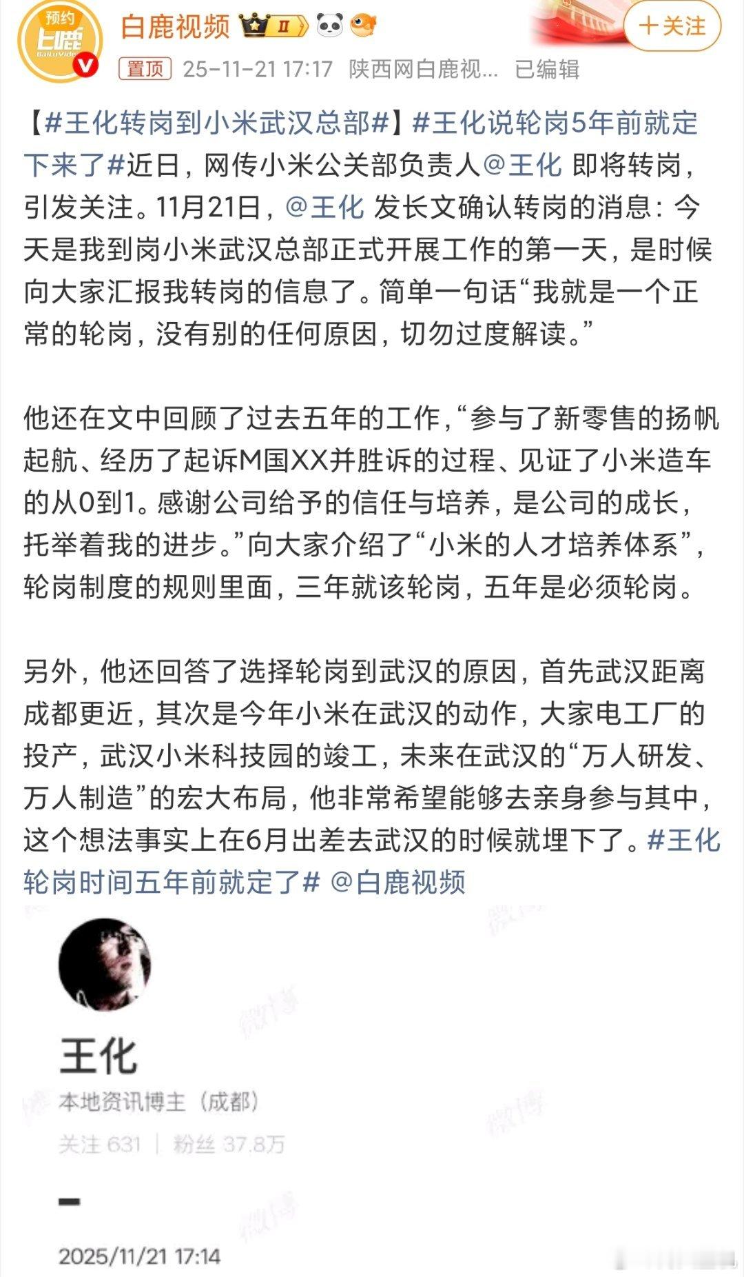 化爷转岗,一些群体又高潮了,殊不知小米的轮岗制由来已久,无非就是多久轮一次,化爷现在转岗来到武汉总部,武汉对于小米的重要意义不言而喻,祝化爷在新的岗位继续发光发热。