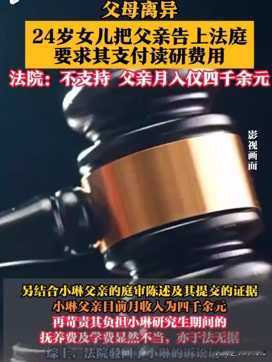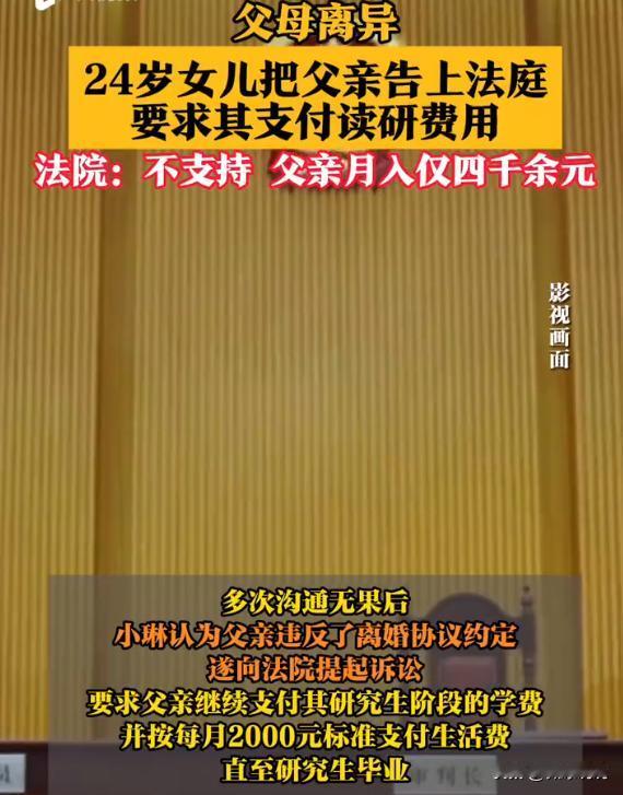 河南郑州,1个24岁女儿状告亲生父亲,要求:按照离婚协议,支付自己读研的所有费用。谁知,父亲拒绝,法院也驳回诉讼请求! 早年,这个小琳的亲生父母因感情不和协议离婚,孩子归母亲,父亲要支付孩子的抚养费和学费等等。 如今小琳上大学了,父亲一如既往的支付孩子的各种费用,怕孩子上学钱不够用,每个月还多给了2000元。 现在孩子已经毕业了,父亲觉得自己可以松一口了。谁知,孩子要继续深造读研。 父亲觉得自己年龄大了,就自己仅仅每个月的4000块钱,已经不够支付她读研的费用。 就跟孩子商量:“爸爸年龄大了,每个月就挣4000元,不够支付你的学费和生活费,你已经23岁,也大学毕业,应该能找个工作来支付学费和生活费了!” 小琳多次沟通无果,觉得父亲违反了协议,于是提起诉讼,要求父亲支付研究生学费和每月2000元的生活费,直到她毕业。法院审理后认为,父亲已经基于道义支付了本科费用,现在他收入有限,再要求他负担读研费用不合理,也不符合法律规定,最终驳回了小琳的请求。 看到这个新闻,我心里挺有感触的。首先,我得说,法院的判决是合理的,我支持这个结果。为什么这么说呢?因为小琳已经24岁了,是个完全成年的人,在法律上,父母对子女的抚养义务一般到18岁就结束了,如果子女还在接受基础教育,比如高中,可能还会延长。 但读研究生属于高等教育,不是义务教育,法律没有强制要求父母必须支付费用。 小琳的父亲月收入才四千多元,这在现在的生活中,可能连他自己都过得紧巴巴的。 想象一下,一个中年人,可能还有自己的家庭负担,比如房贷、医疗或其他开销,每月挣这点钱,如果再被要求支付女儿的学费和生活费,压力有多大? 这不仅仅是钱的问题,更是对个人生活的挤压。 小琳已经本科毕业,完全可以先工作,积累经验,或者通过助学贷款、兼职等方式自己解决读研的费用。 毕竟,成年意味着独立,不只是年龄上的,更是经济和精神上的。 我理解小琳的想法,她可能觉得读研是提升自己的好机会,父母应该支持。 但现实是,家庭经济条件有限,不能一味要求父母牺牲。 父母倾其所有培养我们至成年已属不易,当子女具备独立能力时,更应体谅父母的艰辛。 读研深造虽是好事,但若超出家庭承受能力,自立自强才是最好的选择。这既是对父母的感恩,也是对自我成长的负责。 正如古人所言:“父母之爱子,则为之计深远。”而子女之爱父母,亦当自立自强。成年后的每一份成长,都应是责任与担当的双向奔赴,而非单方面的无限索取。
