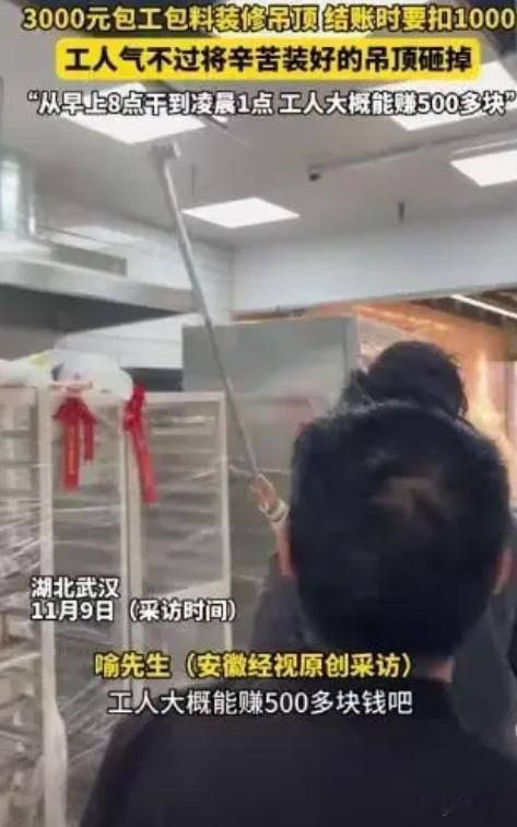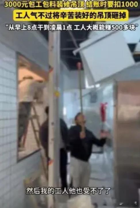 “太欺负人了!”近日,湖北武汉,一老板找人做吊顶,谈好了3000元包工包料,工人从早上8点一直忙到凌晨1点才做完,可结账时,老板却说做的不合适,坚决要扣1000元,工人气不过,将装好的吊顶全拆了。 这事得从便利店老板王老板急着开业,通过熟人找了老李、大刘和小张三个师傅做吊顶。双方口头谈好,3000块包工包料,做完就结账。都没签合同,就凭一句“放心吧,肯定给你做好”。 谁也没想到,这句口头承诺,埋下了雷。 早上八点,三人就开始忙活。量尺寸、裁板材、打龙骨,每个环节都不敢马虎。王老板中间来看了两次,只催“抓紧点,后天要开业”,对施工质量没提任何意见。 真正拼的是时间。小张的冲击钻中途卡壳,跑出去大半天才借到备用机器;老李的老寒腿犯了,爬上爬下的时候,疼得直咧嘴;大刘颈椎不好,仰头作业时间一长就头晕,只能干一会儿歇几口气。 他们这么拼,不是没有理由。老李闺女下个月学费要交,大刘家里老母亲每月药费不能断,小张媳妇刚怀上,正是用钱的时候。这单活扣掉材料成本,三人平分下来也就几百块,但对他们来说,每一分都是救命钱。 一直干到凌晨两点,终于收工。老李特意把现场打扫干净,拍了视频发给王老板。视频里吊顶平整,边角料都打包好了,就等验收拿钱。 没想到等来的是一条冷冰冰的微信:“接缝处有缝隙,看着不舒服,扣1000,就给2000。不同意你们看着办。” 老李赶紧打电话解释:“王老板,那缝隙就两三毫米,不影响使用,我们现在就能回去调整。” “不用了,我看着别扭。”电话那头语气强硬。 再发微信,发现已经被拉黑了。 三人蹲在便利店门口,夜风一吹,心比身子还凉。 “17个小时白干了不说,还要倒贴材料钱?”小张气得手发抖。 “没拿到工钱,这些材料还是咱们的。”大刘突然站起来,“拆!” 凌晨三点,他们又回到便利店,把刚装好的吊顶一块块拆了下来。拆下来的材料整齐码在门口,没碰坏店里任何其他东西。 第二天王老板来开店,看见满地狼藉,直接报了警。 民警来了之后调取监控、查看聊天记录,最后明确告诉王老板:“你这属于单方面违约,扣款没有依据。” 可惜,这时候说什么都晚了。王老板原定的开业计划泡汤,半个月房租、备货损失加起来小两万。而三个师傅,白干了通宵,一分钱没拿到。 这种“口头约定惹的祸”,在装修圈里太常见了。 就像上个月杭州发生过类似的事。吴师傅给一户人家贴瓷砖,2800元包工包料,从早上六点干到晚上八点。完工后房东挑刺,说有的砖缝稍微宽了点,硬要扣600块。最后闹到社区调解,各让一步,扣了300块了事。 但武汉这事,网友们几乎一边倒地站在工人这边。有人说:“17个小时挣500多,还要扣1000,这不是明摆着欺负人吗?”也有人一针见血:“就是吃准了农民工没签合同,不敢较真。” 回过头看,这场两败俱伤的纠纷,本来完全可以避免。 如果开工前花十分钟写个简单协议,把工艺标准、验收方式、付款时间写清楚; 如果完工后王老板能好好说话,让师傅现场调整,或者适当少给点补偿; 如果三个师傅能多个心眼,坚持签个书面约定…… 可惜没有如果。 王老板想省1000块,结果赔进去近两万;师傅们想挣500块,结果白干一整晚。这场纠纷里,没有赢家。 说到底,在靠手艺吃饭的行当里,诚信比什么都重要。雇主不能把别人的辛苦当儿戏,工人也要学会用法律保护自己。 毕竟,谁的钱都不是大风刮来的,谁的汗水也都不是白流的。 一句口头约定,扛不住现实的分量。白纸黑字,不是为了生分,而是为了让付出都有回报,让善良都不被辜负。