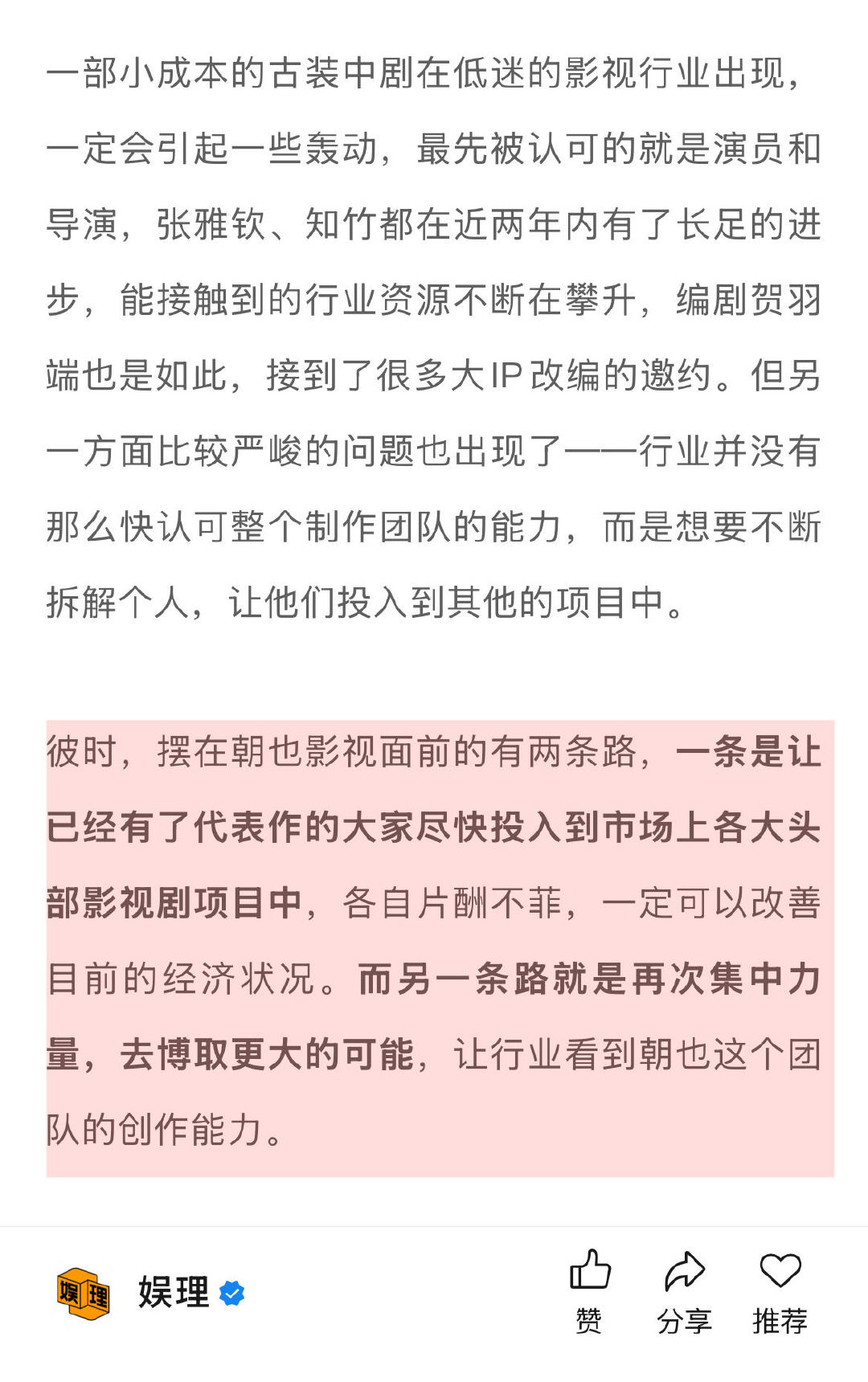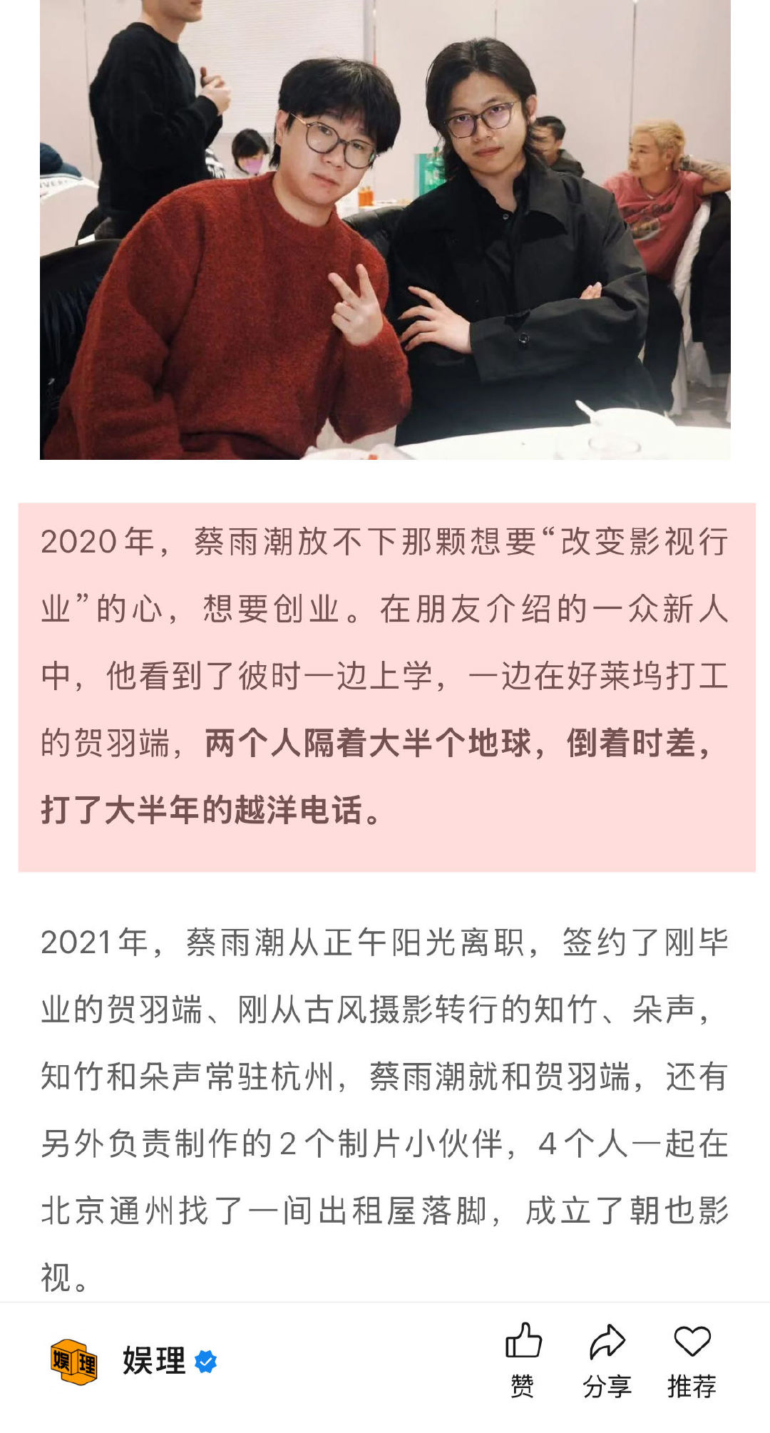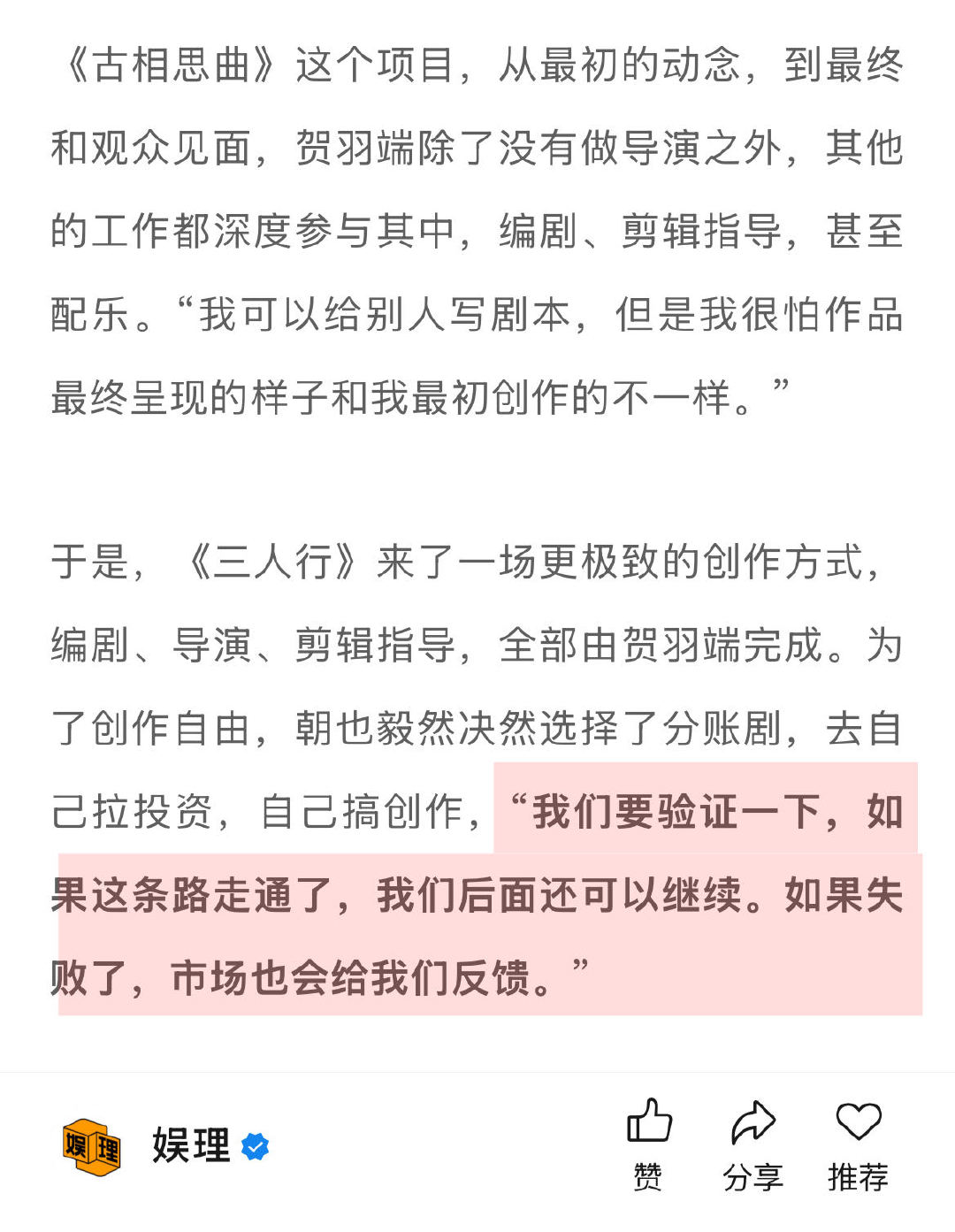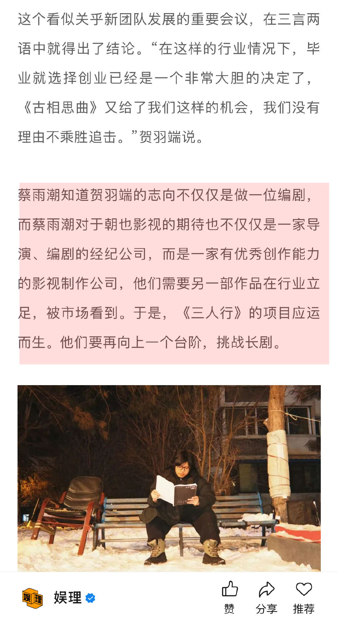《古相思曲》大获成功后,蔡雨潮知道贺羽端的志向不仅仅是做一位编剧,蔡雨潮对朝也影视的期待也不仅仅是一家导演、编剧的经纪公司,而是一家有优秀创作能力的影视制作公司,他们需要另一部作品在行业立足。于是《三人行》的项目应运而生。他们要再向上一个台阶,挑战长剧…↓