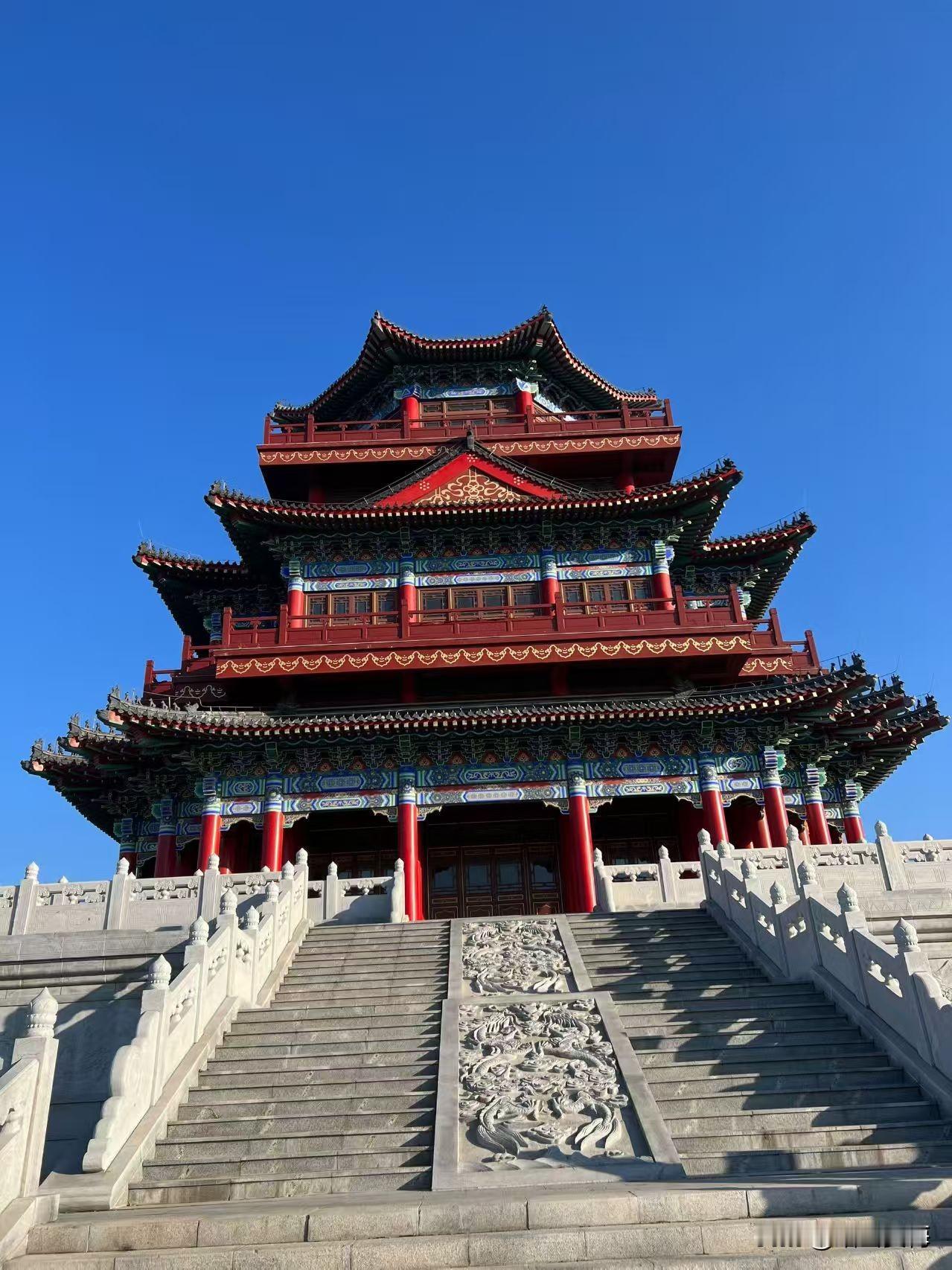 这楼也太有味儿了吧! 红墙金瓦配着湛蓝的天,往上数好几层飞檐翘角,彩绘都亮堂得晃眼。 台阶中间那石雕龙纹老精致了,摸着都能感觉到劲儿。站在下面抬头瞅,古色古香裹着点大气,风一吹好像都能听见过去的响儿。 平时见着的老建筑要么在故宫要么在景点,这楼往这儿一戳,随便拍张照都跟明信片似的,溜达过来瞅一眼,心情都跟着敞亮了! 各位网友朋友们,你们知道这是哪里吗?欢迎评论区留言!