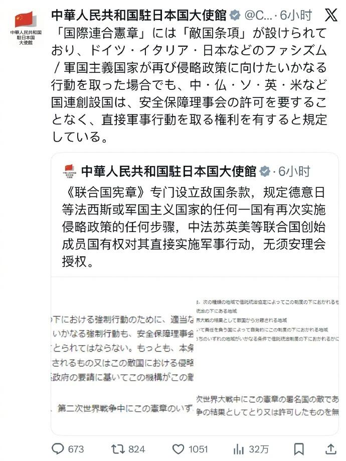 高市早苗涉台句话错误言论首次发声,还在坚持言论符合日本政府立场,不收回错误言论,对于台湾立场保持不变。 中国外交部回应,如果日方真希望能够维持中日战略关系,就应该收回错误言论,付诸实际行动当中。 中国驻日使馆重申联合国敌国条款:若日本有再次侵略的任何步骤,五常可直接实施军事行动。 评3句,第一,美国驻日大使格拉斯声称代表美国总统支持日本首相。单从这一点来看,高市觉得美国表明立场了,所以高市再次发布挑衅言论,殊不知,这一切都是美国的“别有用心”罢了,就是让日本成为美国的“炮灰”。 第二,中国已经向日本下达最后通牒,如果再次有侵略行为,中国作为“五常”国家有资格、有能力直接实施军事行动。奉劝高市早苗早点迷途知返,不要捆绑日本人民的利益“葬身高市挑起的火海中”。 第三,解放军报:必将置日本于万劫不复之地。目的很明确,就是要让高市早苗意识到这次中国维护核心利益的决心。如果日本执迷不悟,一错再错,那就接受14亿中国人的迎头痛击吧!