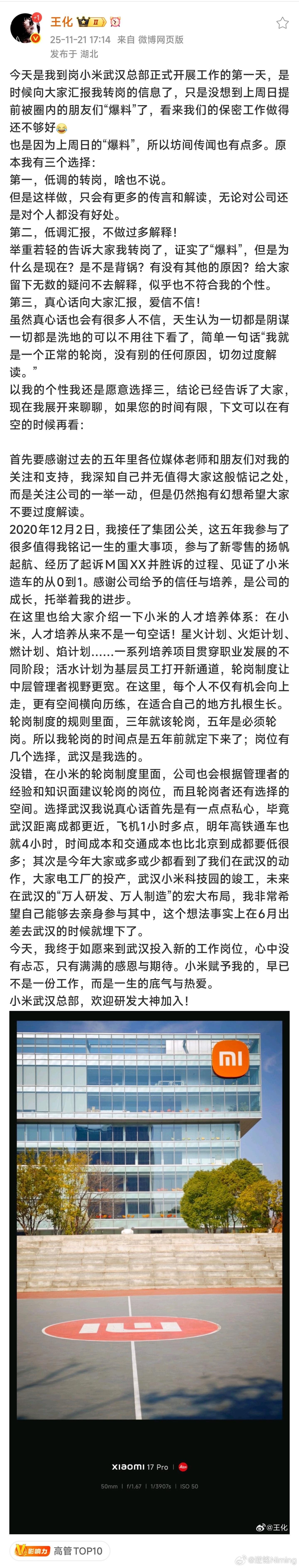 化爷终于出来说了自己轮岗的事情,也澄清了一些谣言,他不是因为干的不好换位置,而是到了集团规定的轮岗时间,换到其他岗位工作了,大家也不需要多猜,武汉承载了小米大家电的未来布局,甚至你要是消息足够灵通,还能知道很多更远的规划。而最近小米公关的一些变化,大家也不要归结于领导层的变更,因为事情的变化都不是瞬间完成的,现在发生的事情肯定是更早以前的规划,如果真的是因为领导换人而转变风格,肯定不会发生在这几天,而是更远的未来。且不说新的领导上任了没,哪有人一上任就动这动那的。这几天小米的及时公关辟谣,甚至包括前几天雷总在微博上为自己发声,涉及到的转变,或许都有更多更深层次的因素,不过这就不是我们能猜的到的了。希望我米公关未来的工作可以更顺利,资源也可以更多一些吧,这么多年,他们真的太辛苦了