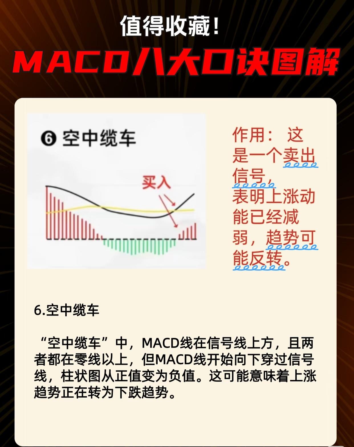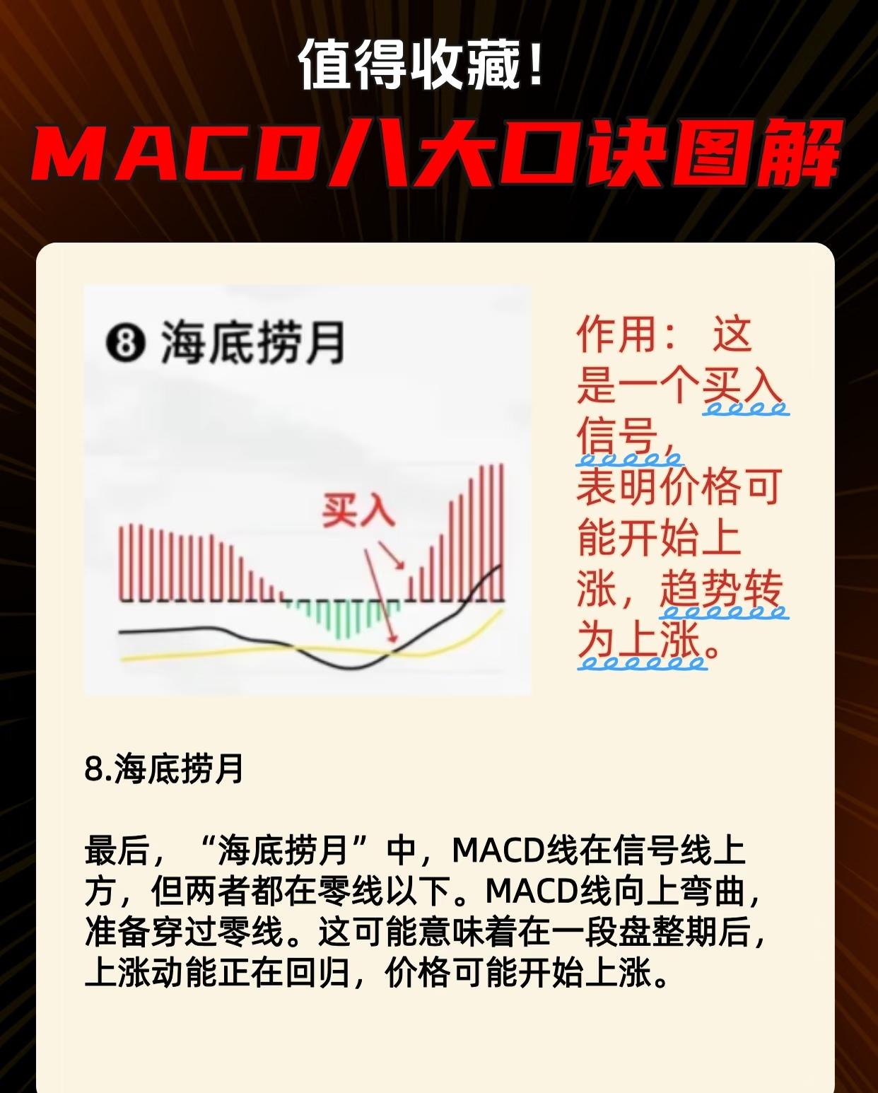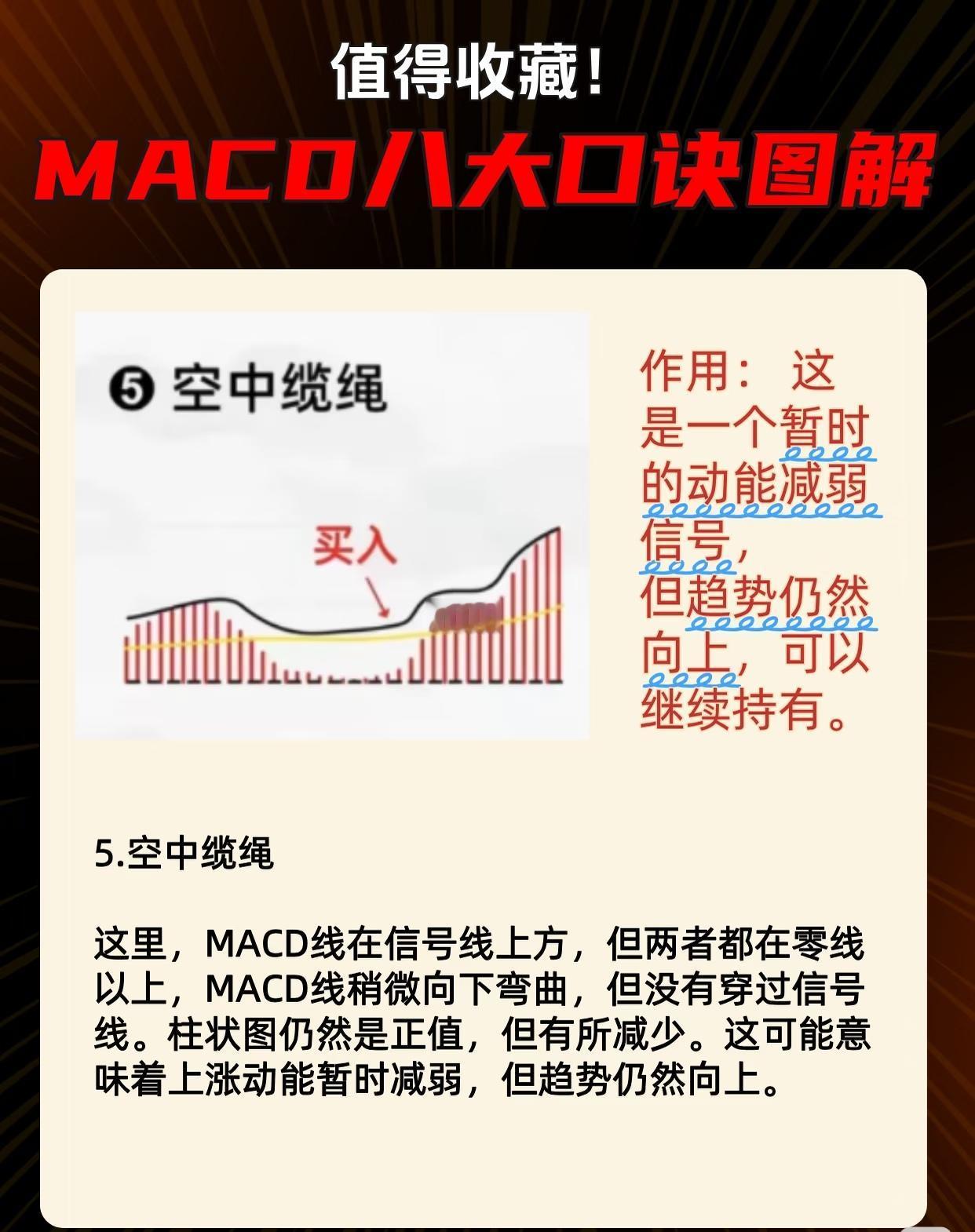 以下是对MACD技术分析教学图的核心内容总结,按形态分类归纳关键信息与操作信号: 一、MACD八大口诀图解概览 系列标题为「值得收藏!MACD八大口诀图解」,每张图通过MACD指标(含MACD线/信号线/柱状图)的特定形态,明确标注买入/卖出信号,并解释其对应的市场趋势含义。 二、八大形态详解与操作信号 1. 买入信号类(共6种形态) (1)佛手向上 - 特征:MACD线在信号线下方→向上穿过信号线(金叉),柱状图配合。 - 作用:明确的买入信号,预示价格可能开始上涨。 (2)小鸭出水 - 特征:MACD线在零线以下→向上突破零线,柱状图从负值转正值。 - 作用:买入信号,表明下跌趋势可能结束,上涨趋势即将启动。 (3)漫步青云 - 特征:MACD线与信号线均在零线以上,且MACD线在信号线上方;柱状图保持正值。 - 作用:持有信号(非严格买入),说明上涨趋势强劲,可继续持仓。 (4)天鹅展翅 - 特征:MACD线在信号线下方但均在零线以上,MACD线向上弯曲准备穿信号线(即将金叉)。 - 作用:买入/加仓信号,预示盘整后上涨动能回归,趋势可能恢复。 (5)空中缆绳 - 特征:MACD线在信号线上方且均在零线以上,MACD线轻微向下弯曲但未穿信号线,柱状图为正但减少。 - 作用:趋势延续信号(非严格买入),动能暂时减弱但趋势仍向上,可继续持有。 (6)海底捞月 - 特征:MACD线与信号线均在零线以下,MACD线向上弯曲准备穿过零线。 - 作用:买入信号,表明盘整后上涨动能回归,价格可能开始上涨。 (7)海底电缆 - 特征:MACD线与信号线均在零线以下,MACD线向上穿过信号线(金叉),柱状图由负转正。 - 作用:买入信号,预示下跌动能减弱,市场可能反弹。 2. 卖出信号类(共1种形态) (8)空中缆车 - 特征:MACD线与信号线均在零线以上,MACD线向下穿过信号线(死叉),柱状图由正转负。 - 作用:卖出信号,表明上涨动能减弱,趋势可能反转向下。 三、核心逻辑总结 1. 零线是关键分界: - MACD线/信号线在零线以上通常代表多头市场(上涨动能主导);在零线以下代表空头市场(下跌动能主导)。 - 柱状图正值(红)为上涨动能,负值(绿)为下跌动能。 2. 金叉/死叉的强化意义: - 金叉(MACD线上穿信号线):在零线以上出现(如漫步青云、空中缆绳)多为强势信号;在零线以下出现(如海底电缆、海底捞月)预示反弹启动。 - 死叉(MACD线下穿信号线):在零线以上出现(如空中缆车)提示趋势可能反转下跌。 3. 趋势阶段适配: - 买入信号覆盖“趋势启动初期”(佛手向上、小鸭出水)、“盘整后恢复”(天鹅展翅、海底捞月)、“下跌反弹”(海底电缆); - 卖出信号针对“上涨末期动能衰减”(空中缆车); - 持有信号用于“趋势延续期”(漫步青云)。 四、用户使用建议 - 收藏参考:系列图解通过直观图表+文字解析,适合快速识别MACD典型形态对应的买卖时机。 - 结合其他指标:实际交易中建议配合成交量、K线形态等综合验证信号有效性。 - 重点关注零线与交叉:零线位置决定多空基调,金叉/死叉位置决定信号强度。