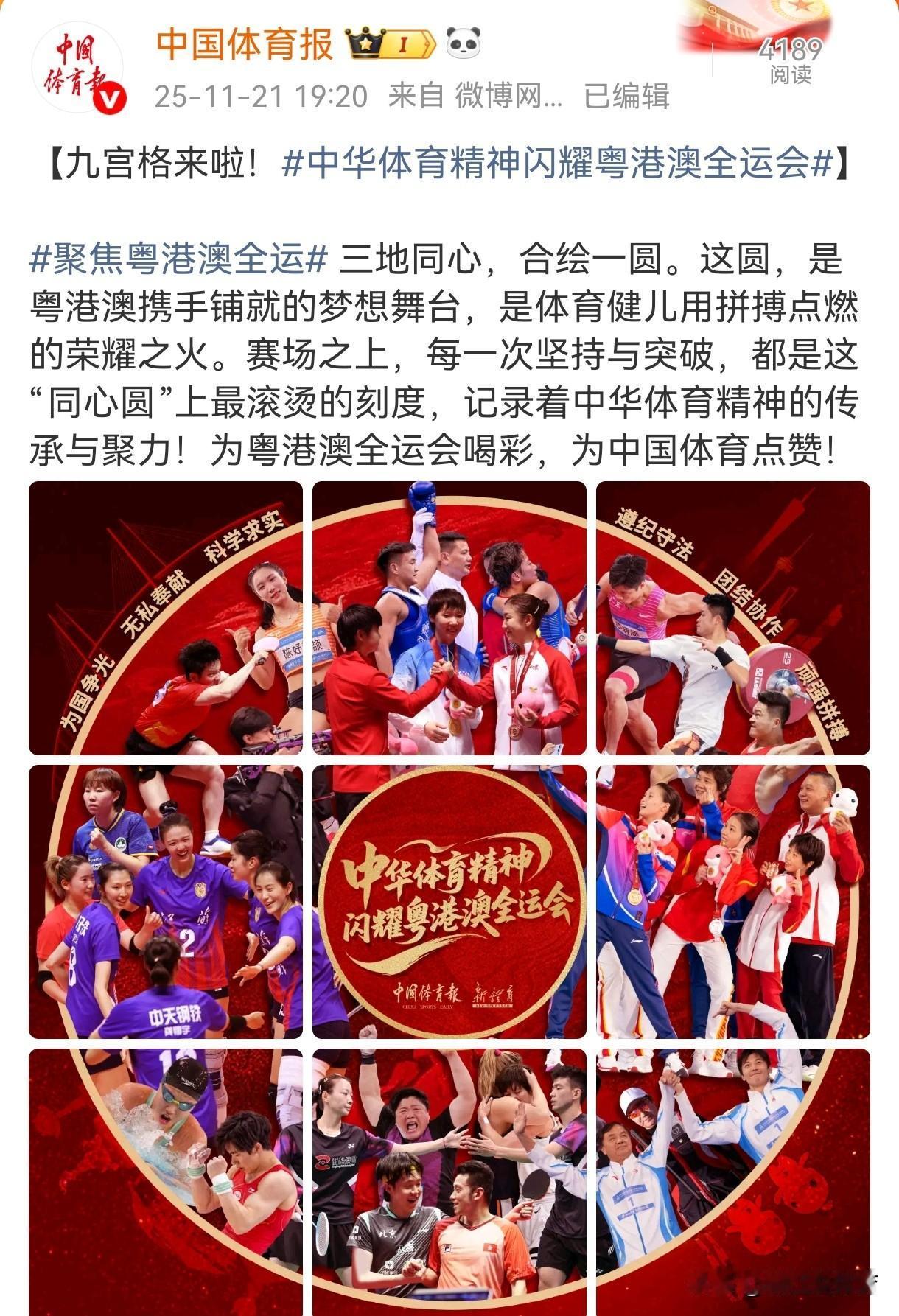 体育总局官媒《中国体育报》以“中华体育精神”为主题发布“九宫格”图片,江苏女排占据一席之地。敢打敢拼的江苏女排以全胜战绩夺取冠军,而江苏女排队长龚翔宇甚至带病作战,于11月9日还在澳门住院并接受治疗,但是之后的她又勇敢的站在了赛场上,帮助江苏女排夺得冠军。每一次坚持与突破,都记录着中华体育精神的传承与聚力。中国女排队长龚翔宇以身作则,在大湾区全运会上以团队至上、集体为先,更诠释了什么是“女排精神”。