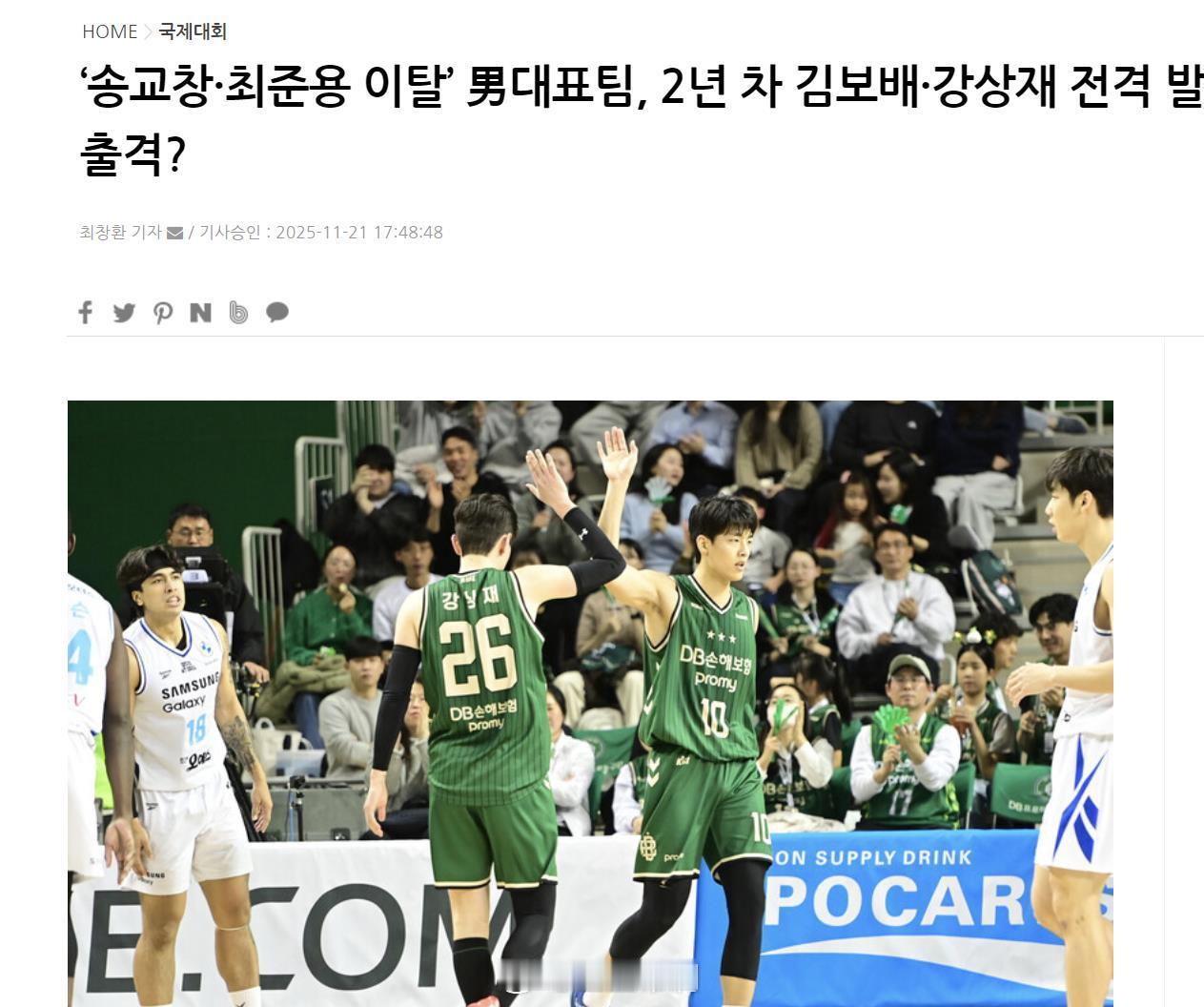韩国男篮世预赛第一窗口期名单正式第二次更换,由于宋教昌和崔俊龙受伤,在检查后不能出战,最终金甫裴和姜相宰替换入选,两人22日将会进队参加集训。两人都是原州DB的球员,所以12月1日他们将在自己的俱乐部主场出战。金甫裴(图3)是第一次入选韩国男篮,他是2024年的选秀球员,第三顺位被原州DB选中。而姜相宰打过雅加达亚运会和2025年亚洲杯预选赛。至此,韩国男篮在11月4日直接公布了12人集训名单,目前已经两次因伤更换了3人,12日,柳基相被文正贤替换。21日,宋教昌和崔俊龙被金甫裴和姜相宰替换。按照计划,他们这几天集训,25日会和安阳进行一场练习赛,26日前往北京。韩国队目前世预赛第一窗口期名单:(机翻+综合)李政贤、边俊亨、梁俊锡、李贤重、安英俊、李佑锡、李元锡、河润基、李承铉、文正贤、金甫裴、姜相宰