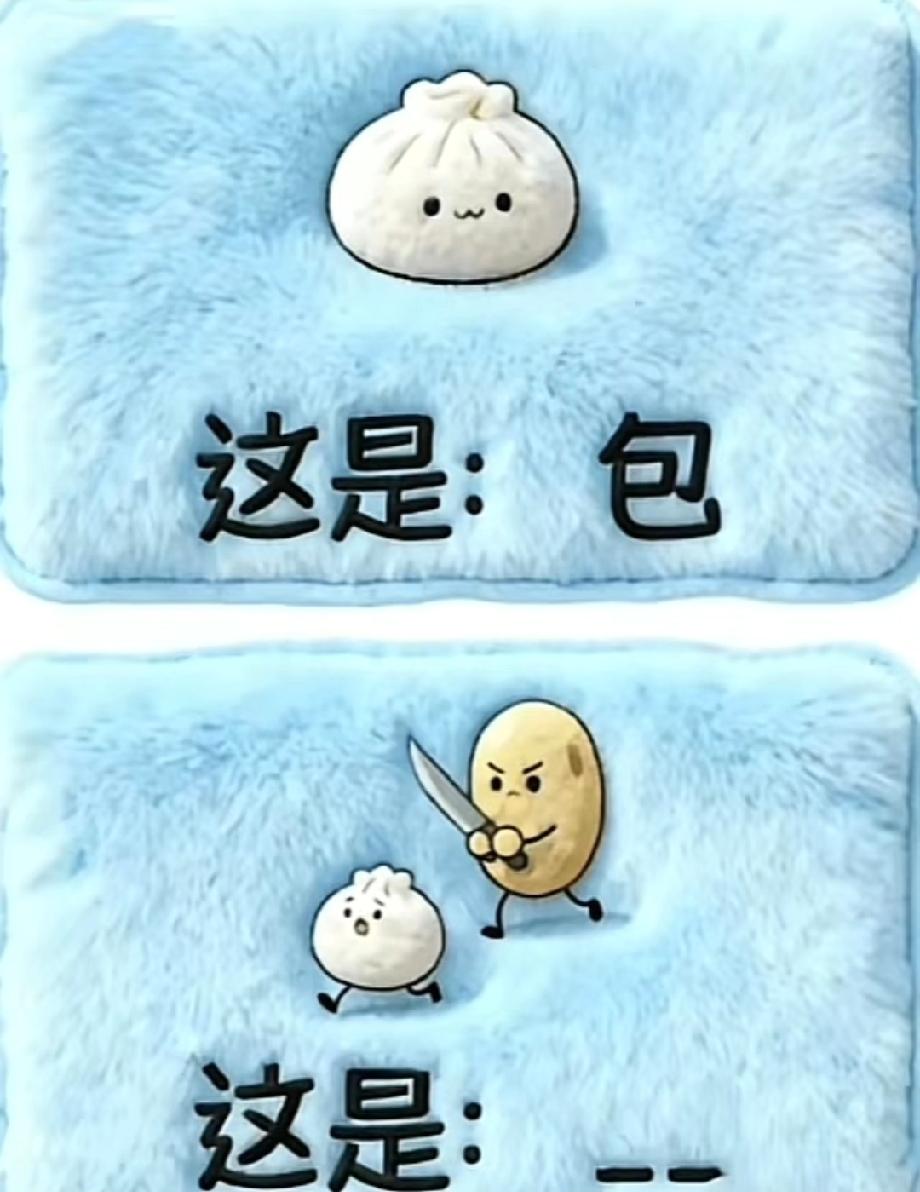 这图的脑洞绝了!上面写‘这是包’,下面土豆拿刀切包,对应的词90%的人猜不对!