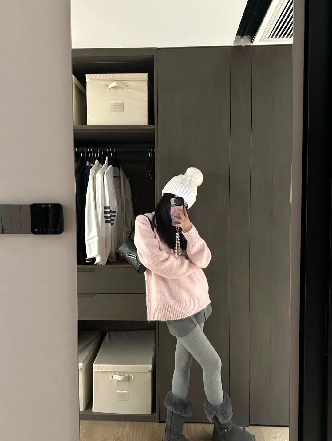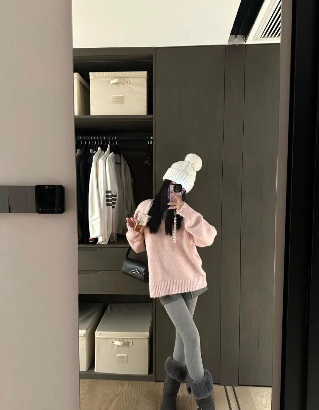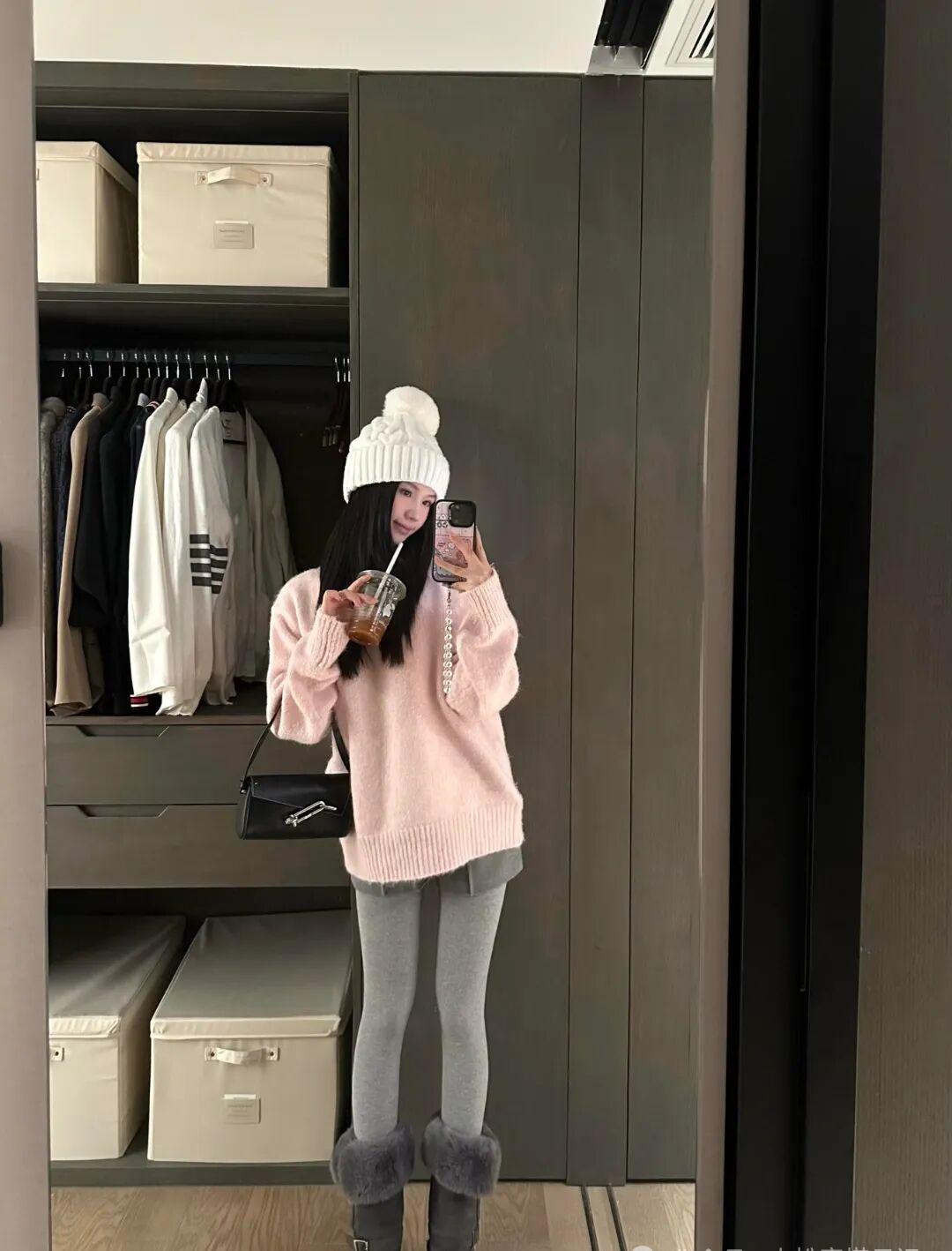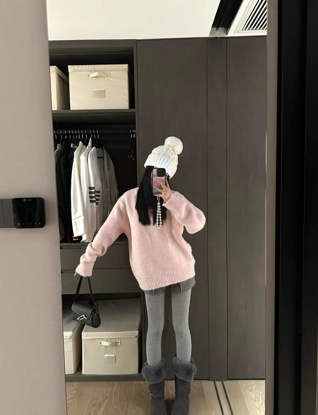 冬日穿搭指南:粉色毛衣+灰色打底裤+毛绒靴,温暖又时尚!🌟👗👢