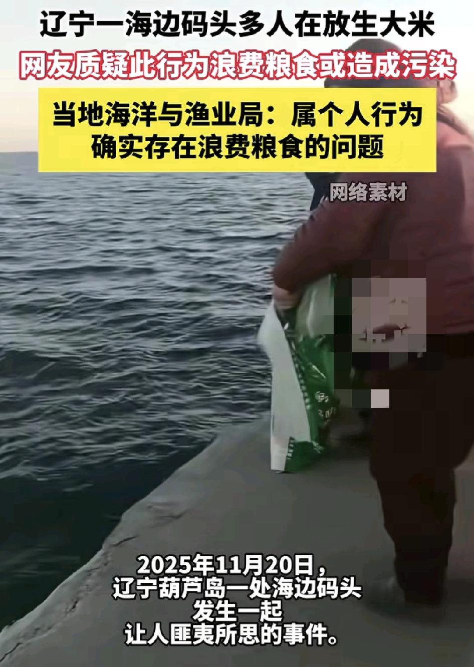 辽宁葫芦岛有网友发视频称,几名中年大妈在海边码头放生大米,把一袋袋的大米倒入海边,嘴里还念念有词,网友称非常不理解他们的行为,这些零食就这样浪费了,哪怕是送给有需要的人群也好。有关部门称,这属于个人的行为,这样既是浪费粮食,又有可能会给海洋造成污染。