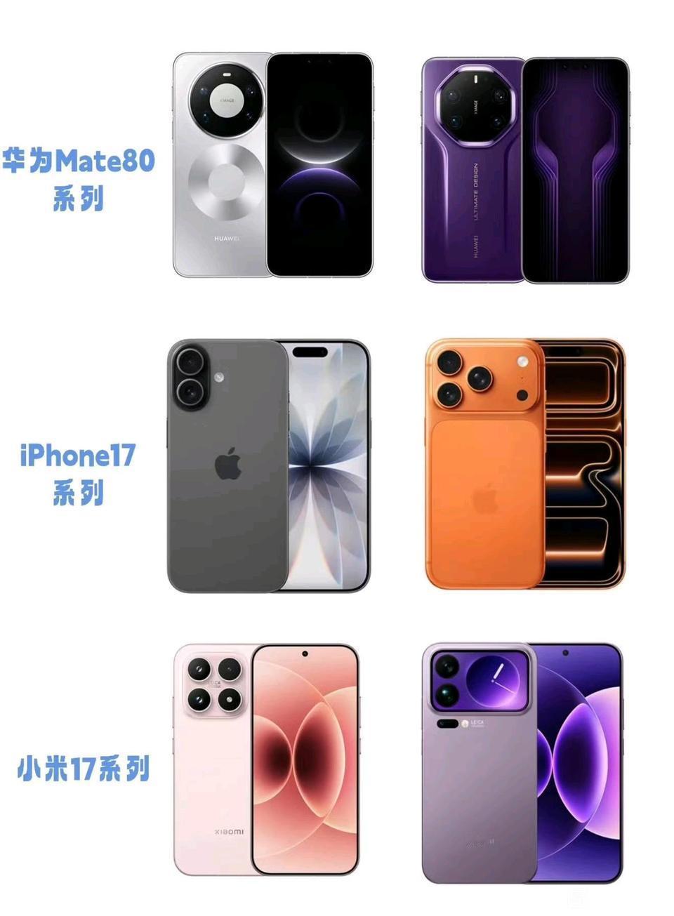 单看外观,华为Mate80系列、iphone17系列,小米17系列,你觉得哪个好看? 华为Mate系列、iphone数字系列跟小米数字系列,这是国内销量最高的,同时也是流量最大的三个旗舰机型。 今年这三家旗舰机外观都进行了重新设计,华为Mate80系列倒是里面变化最小的,iphone跟小米的外观变化大,跟前代相比,简直判若两人。 从外观上来看,我个人觉得华为Mate80系列质感最好,尤其是Mate80RS保时捷,绝对是里面最霸气的一款。