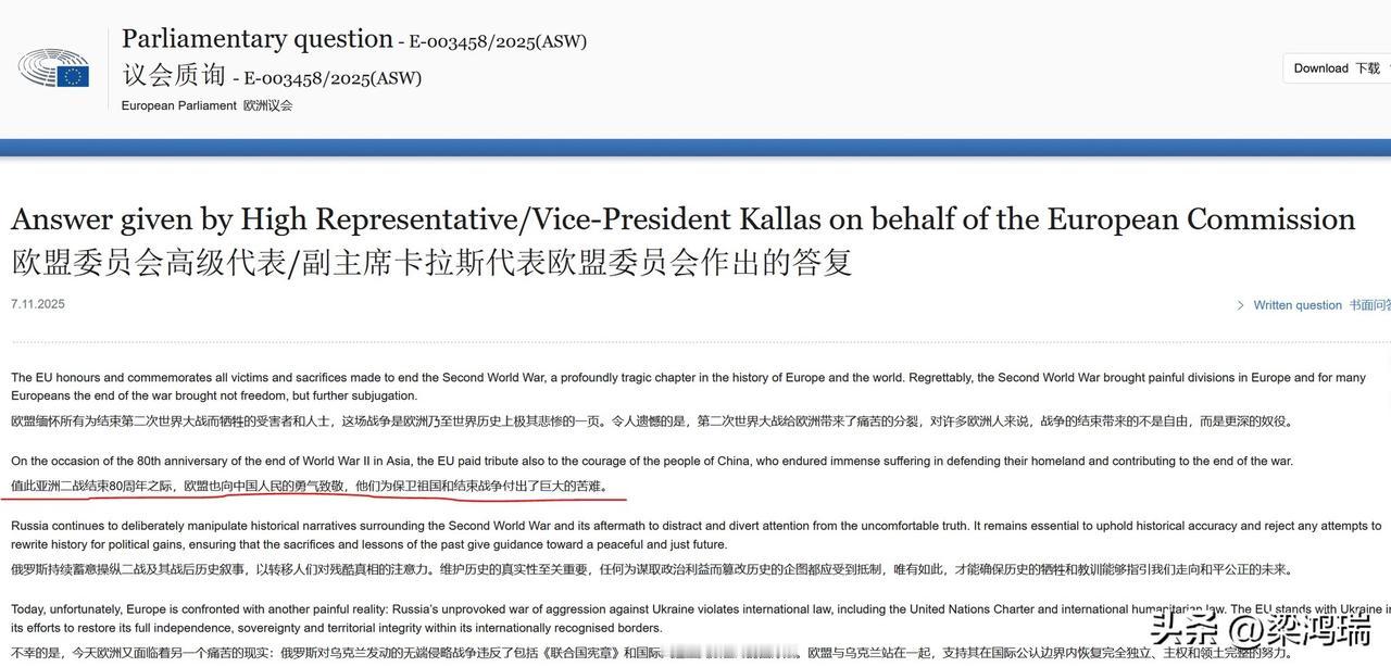 卧槽,拿错了剧本了么?卡拉·卡加斯居然在11月7日欧洲议会的书面质询中说“向中国人民的勇气致敬,他们为保卫祖国和结束战争付出了巨大的苦难。” 这是欧盟委员会高级代表/副主席卡拉斯(Kallas)代表欧盟委员会对一个议会质询(E-003458/2025(ASW))作出的书面答复,日期为2025年11月7日。