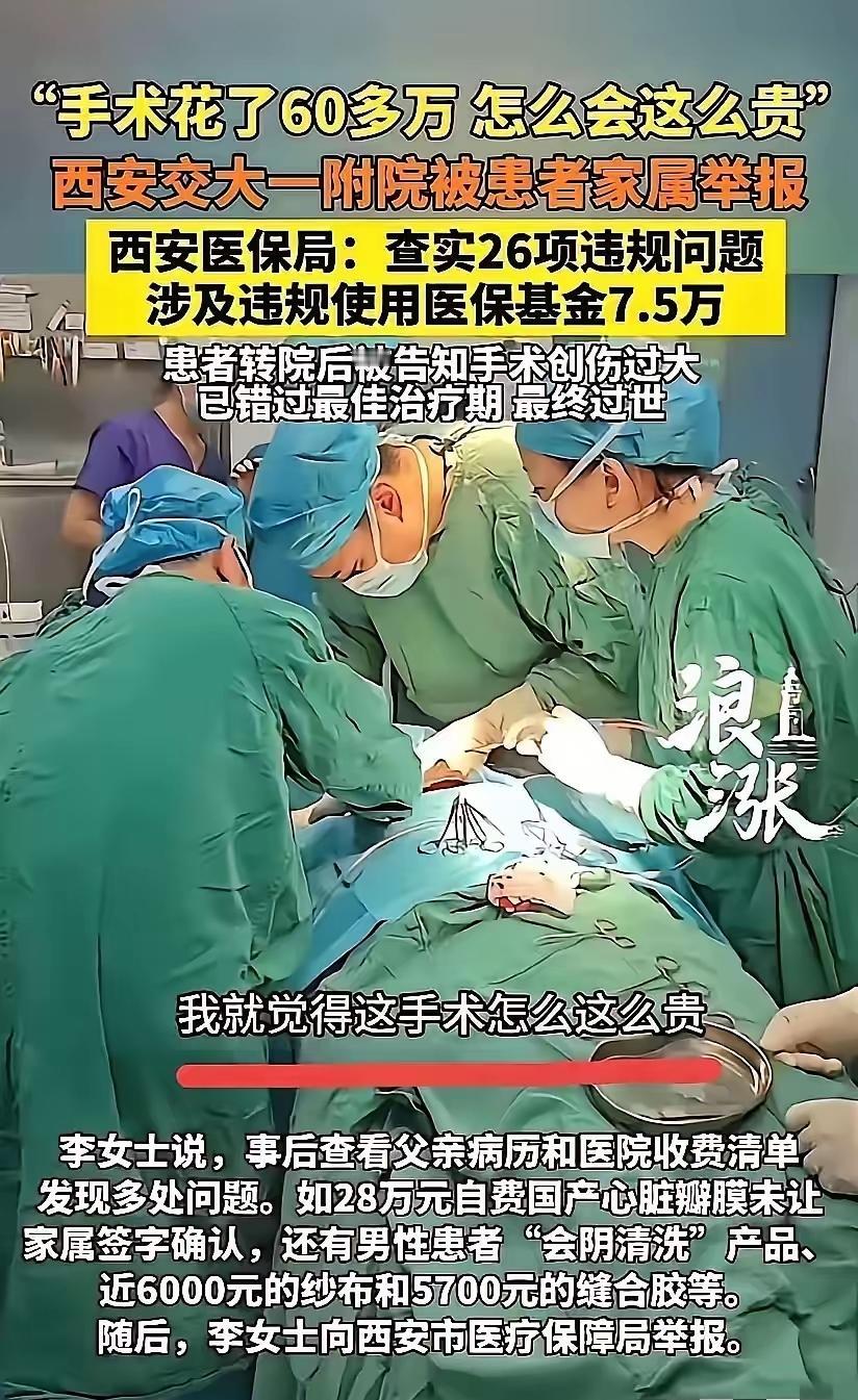 手术竟然花六十多万 错过最佳救治时间 人还是没留住,但 李女士四年死磕西交大一附院,真的给所有患者家属争了口气 60多万手术费没留住父亲,反而扒出一堆离谱操作:中度狭窄本不用手术却被劝着上了台,28万瓣膜没签字就用,纱布花6000、缝合线5700,连34次会阴冲洗都敢收费。 更讽刺的是,43项违规查实26项,医保基金被套走7万5,李女士维权四年只拿到2200多奖励。 医院连主刀医生都查不清,病历写得乱七八糟,一审判七成责任还敢敷衍,这哪是治病,分明是把患者当提款机! 医疗不是生意,信任更不能被挥霍,监管早该给天价收费和违规诊疗上紧箍咒了。 你觉得该怎么杜绝这种医疗乱象?评论区说说你的看法!