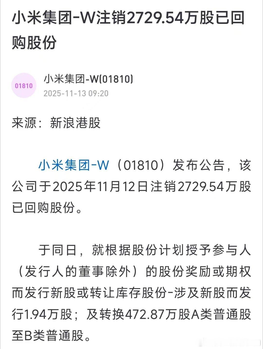 继昨天回购了5亿港币之后,小米今天又回购了3亿港币,显示了持续回购的决心。三季报之后的回购时间其实是全年里最长的,因为下一次财报会是明年三月下旬。另外,很多朋友问我小米回购的股票是否会注销?其实,虽然去年港交所有了新规则允许公司不再注销回购股票;但小米还是坚持回购后注销,减少公司股本,给股东带来实实在在的好处(例如可以看11月12日的公告)。