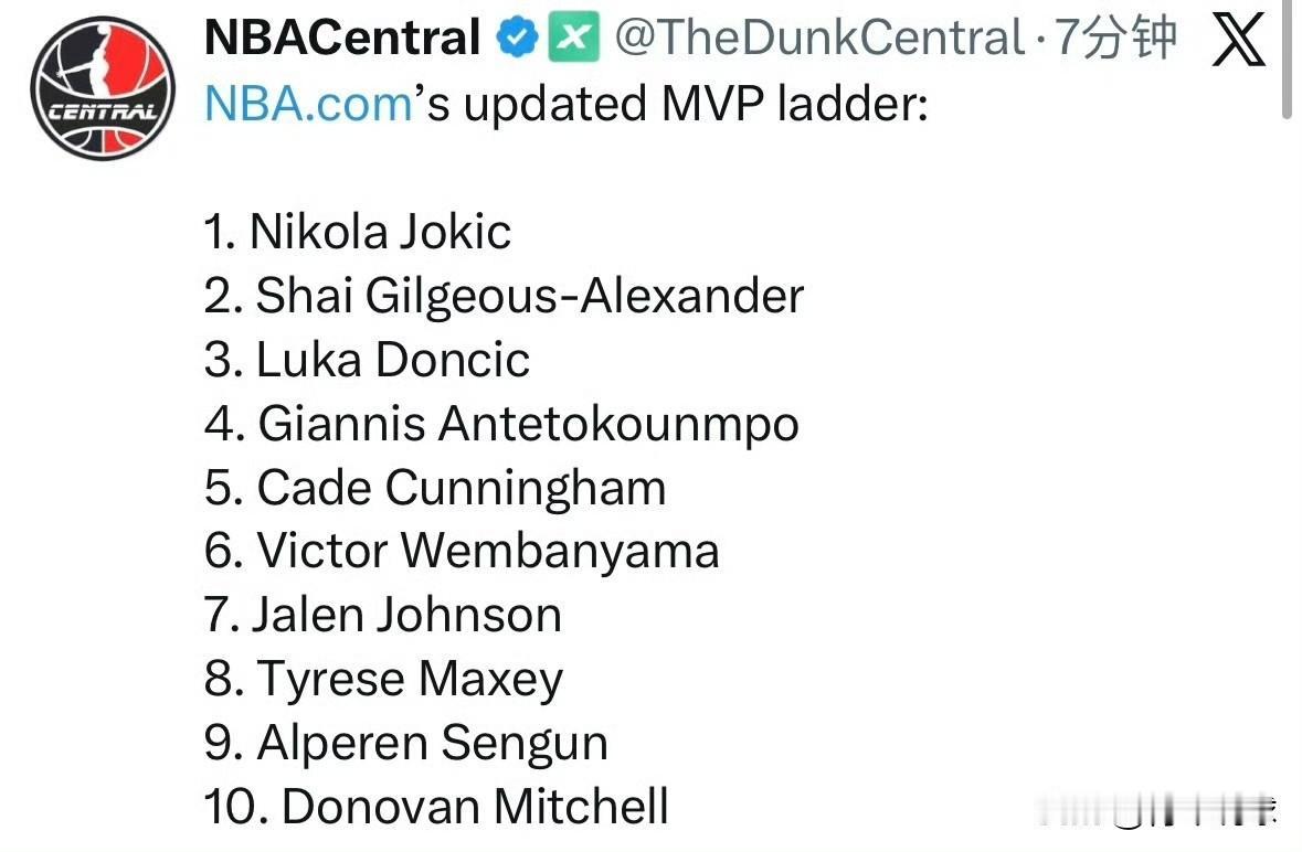 新赛季至今最新MVP排行榜,东契奇升至第三! NBA官方公布了最新一期的常规赛MVP排行榜,约基奇、亚历山大继续排名前二,东契奇升至第三位,坎宁安升至第五位,老鹰队球员约翰逊排名第七位,库里掉出了榜单。 MVP榜一直都是约基奇和亚历山大争夺榜首,东契奇凭借场均得分王的表现有望参与竞争。坎宁安带领活塞豪取11连胜排名高居东部第一,约翰逊异军突起带领老鹰队在没有特雷-杨的情况下取得5连胜,两人出色的表现也得到了联盟的青睐。勇士队球星库里由于伤病轮休及状态起伏不定,加上球队战绩不佳,已经跌出了MVP排行榜前十。在你看来,还有谁值得进入MVP前十的讨论?