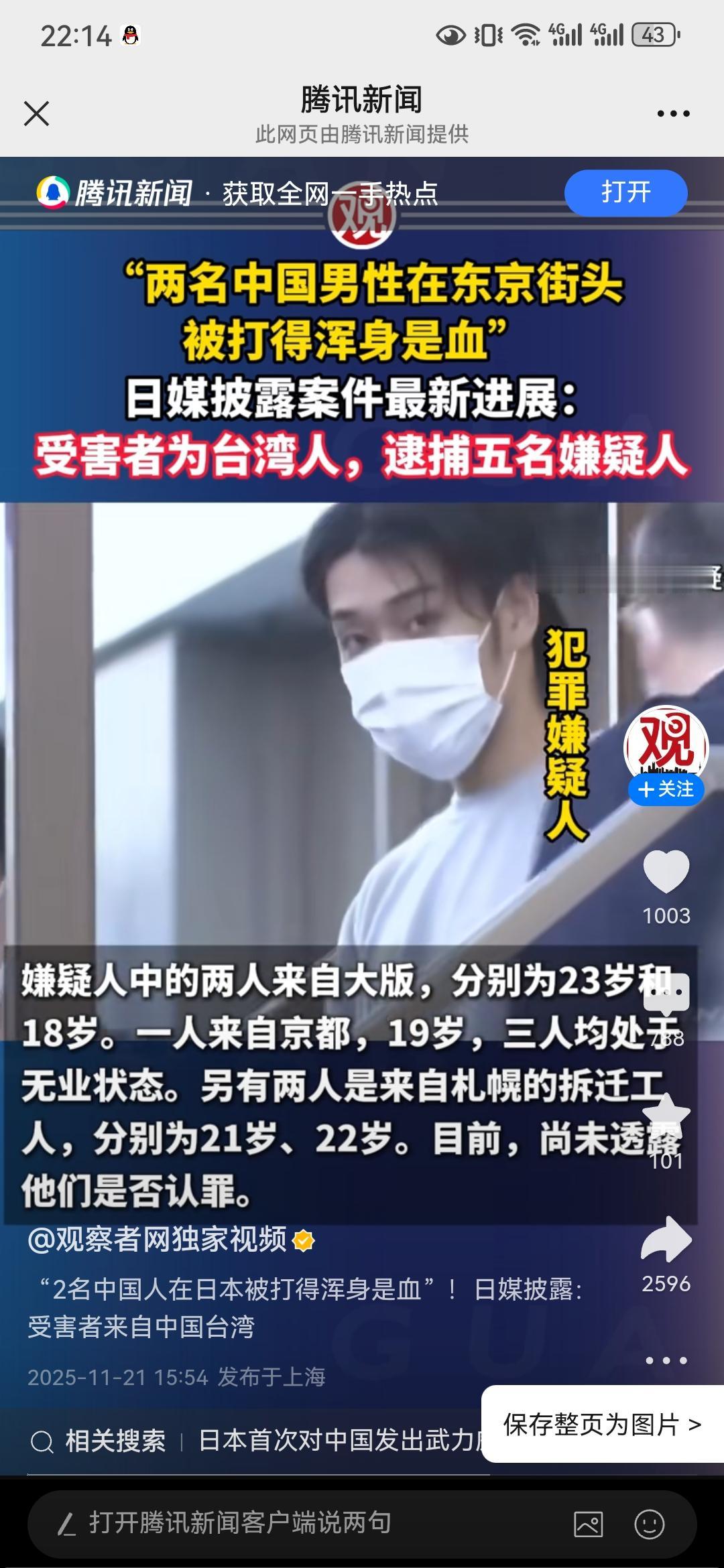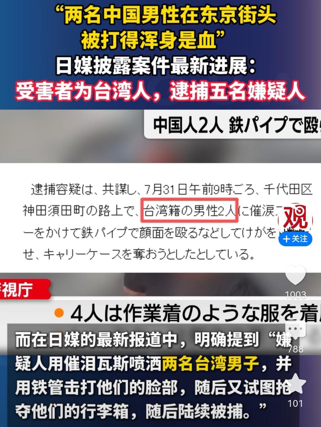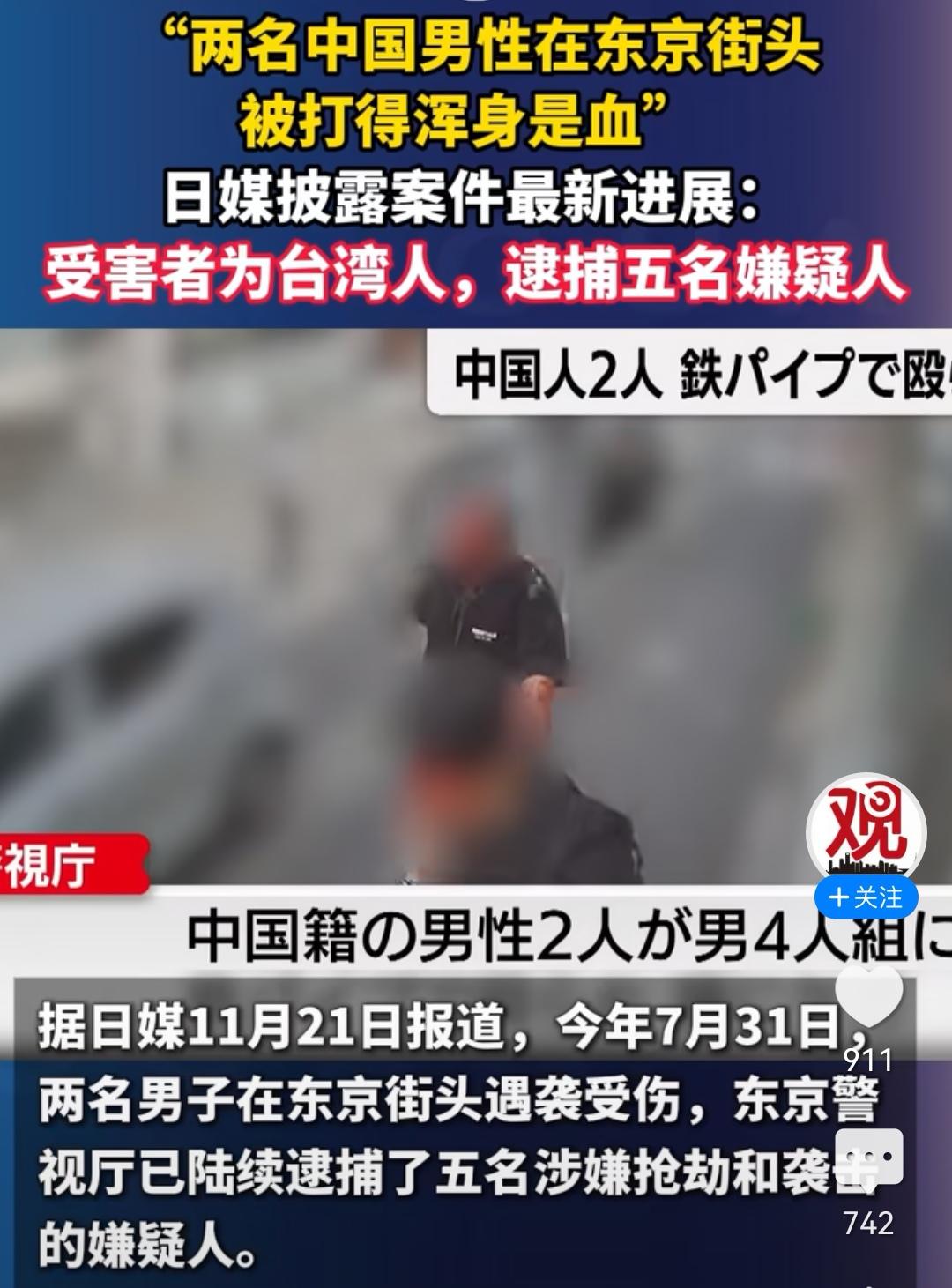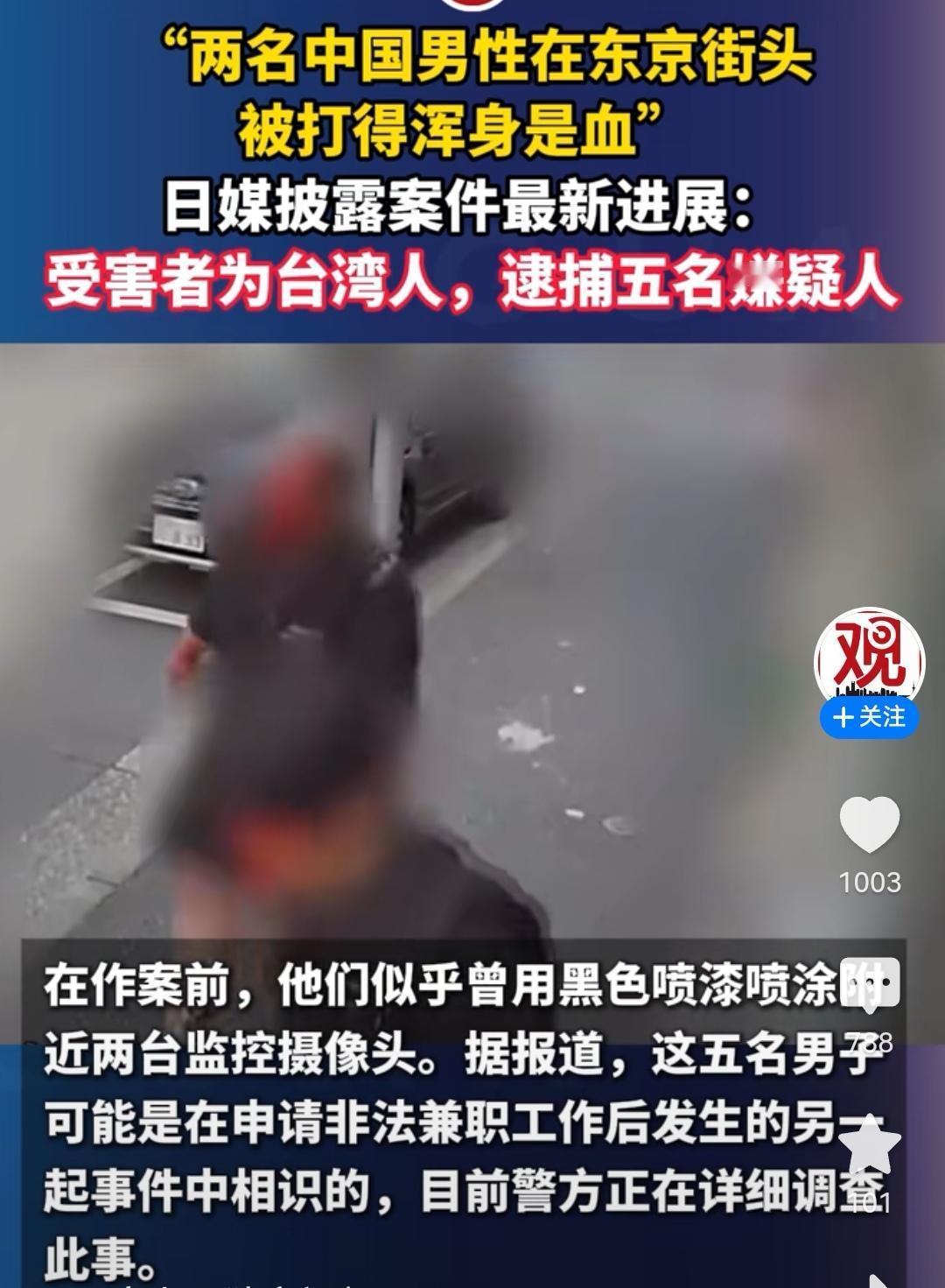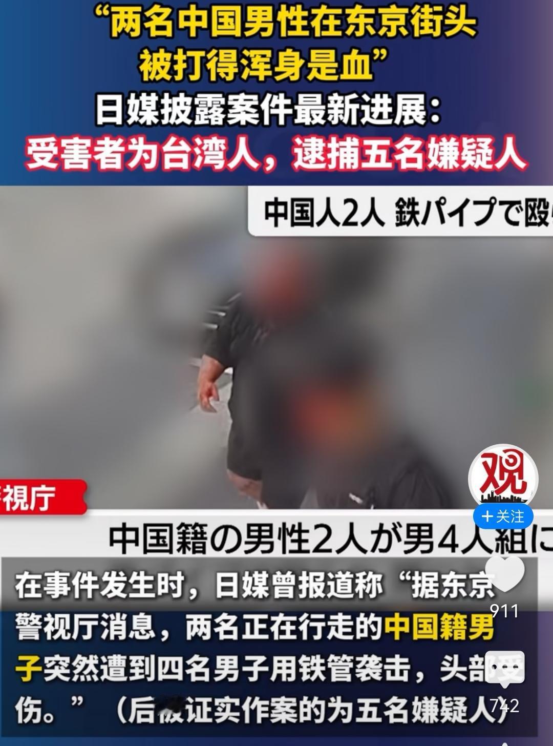 突发!突发! 2名中国男子在东京街头被4名日本歹徒袭击,导致受重伤,警察介入调查后发现受害者为中国台湾人。 说打的冤,还是不冤,但至少都是中国人。许多网友说,中国可以联合起来抗议讨回公道,以此救助同胞,同时也能起到感化的作用。 看看,华夏子女多仗义。 此次恶性事件,日媒披露4名歹徒中2名来自大阪,2人来自札幌,2人无业,2名为搬运工,行凶过程中先是用催泪瓦斯喷其脸部,后用铁管袭击头部导致流血不止,中间试图抢夺行李箱。 手段确实够狠的,不往死里弄都不行。 此事件暴露了日本社会治安的混乱,以及中国人在日本的危险程度,所以前期我国外交部提醒非必要不要去日本,也不知台湾同胞们收没收到通知。 “小日子”别看表面点头哈腰,其实内心又狠又坏,要不怎么发动侵略战争,欠下了南京大屠杀等的血债。 此事件也给中国台湾地区的“台独”精日分子敲响了警钟。一味地搞分裂,搞“台独”“跪日”“媚日”,带来的是同胞在日本的歧视和殴打,甚至流血付出生命,特别是赖清德之流,大陆暂停了进口日本水产品,他却叫起了板,演戏以吃日本的“水货”为荣,帮敌人做宣传,被台湾民众骂成了“穷酸样”。 台湾的民众也应该醒醒了,“两岸”一家亲血浓于水,依靠“小日本子”根本不会有好下场,统一以后才能共同抵制外寇。