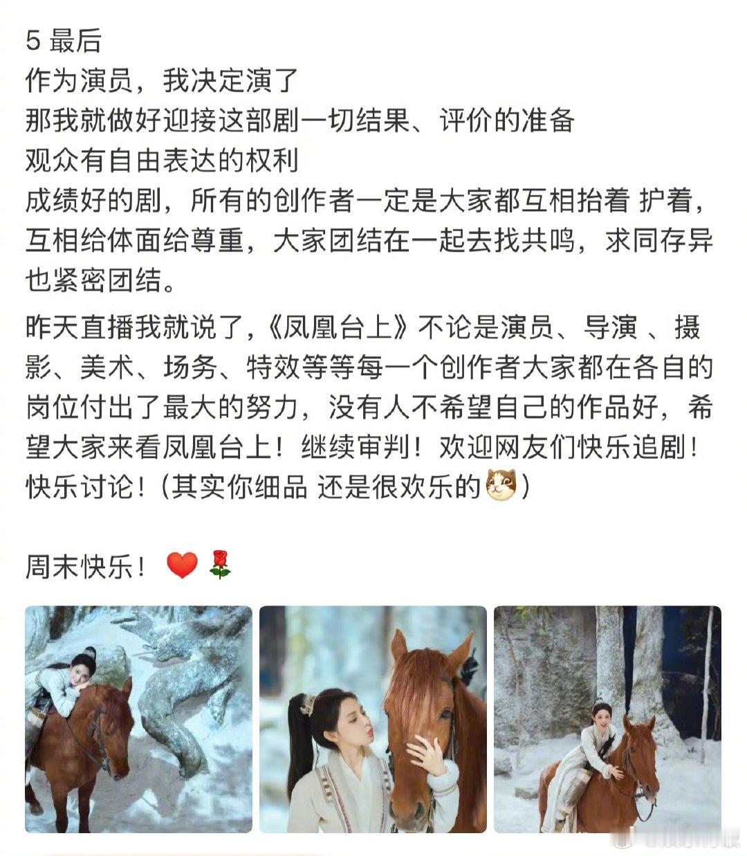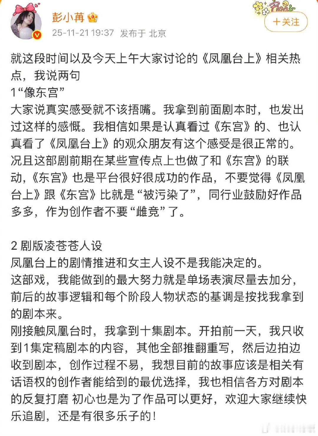 彭小苒针对凌苍苍的人设讨论进行回应。她解释道,角色的成长线和状态转变均依据剧本展开,演员的能动性在于通过表演细节去丰富角色。她感谢观众关注,并表示会继续专注于演技打磨。