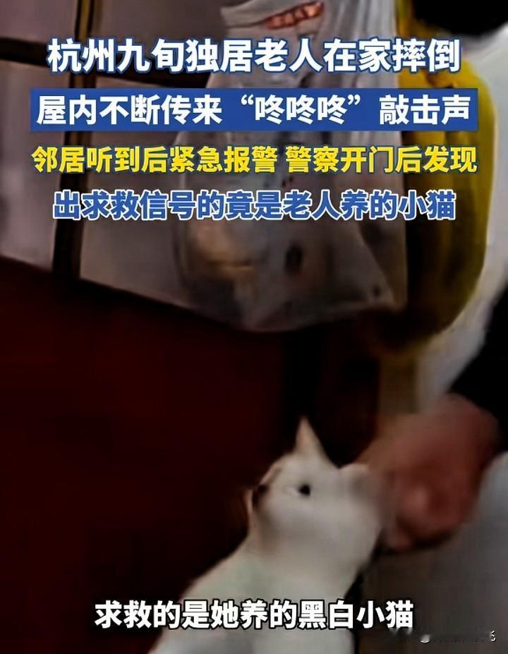 彻底解释不清了!杭州李奶奶家的那只白花猫简直成了精,它的一个举动成功救下主人一命,真的让人既感动又觉得好神奇。 李奶奶是个九十多岁的独居老人,平常家里就只有一只小白花猫陪着她过日子。 11月20日那天,李奶奶不小心在家里摔倒,人也失去了意识。 在这个紧急关头,李奶奶家那只小白花猫竟然做出了一个让人难以相信的举动,从而成功救了老人一命。 这件事,说出来大家觉得很玄乎,可是却是事实。 话说,白花猫在老人倒地不动之后,它既没有置之不理,也没有围着老人乱叫,而是持续性地敲打发出“咚咚咚”的声音向外界求助。 而那天,恰巧李奶奶预约了一个维修煤气灶的孙师傅上门维修。 孙师傅到了李奶奶家门外,敲门却一直敲不开。可是,停下来不敲门,却又能听到房子里面“咚咚咚”的声音不断。 孙师傅也是一个比较细心的人,他联想到接预约电话的时候,听出客户的声音应该是一个老人。 他心想,老人不开门,是不是出了什么状况,于是连忙掏出手机报警。 警察过来,敲门同样没人回答,站在门外试着朝屋内喊话,“阿姨,如果你觉得有危险的话,就敲两下地板。” “咚咚”。 民警听到这两声响,立马让人从门外开锁,大家进屋一看,发现李奶奶倒在地板上,人已经昏迷失去了意识。 警察在李奶奶家转了一圈,看到家里除了昏迷不醒的老人就只有一只小白花猫。 这个时候,大家才意识到,原来那个不断的“咚咚”声,是这么一只不起眼的小猫弄出来的动静。 而后来,李奶奶在大家的合力救助下,人慢慢清醒,手脚也能动弹了。 你们说,怎么会有这么聪明的小猫呢? 它竟然懂得通过敲击,发出声音来引起别人的注意。 这还不算什么,更神奇的是,警察门外喊话叫敲两下地板,它不但真的能听懂话。 而且,它还知道数数,敲两下就两下,不多也不少。 要我说,这哪是一只小猫啊,这不就是一个人类吗? 以前听说过很多忠犬护主的故事,没想到,一只小猫也这么忠心。 我们总说,人与人之间,爱是相互的。 其实,人与宠物之间也是如此。你爱护它们,它们也会纯粹地爱着你,你疼它们一分,它们会护着你十分。 这么聪明有灵性的小猫咪,真的是可遇不可求啊! 微距-万物有灵 宠物 素材来源网络——潮新闻,侵删