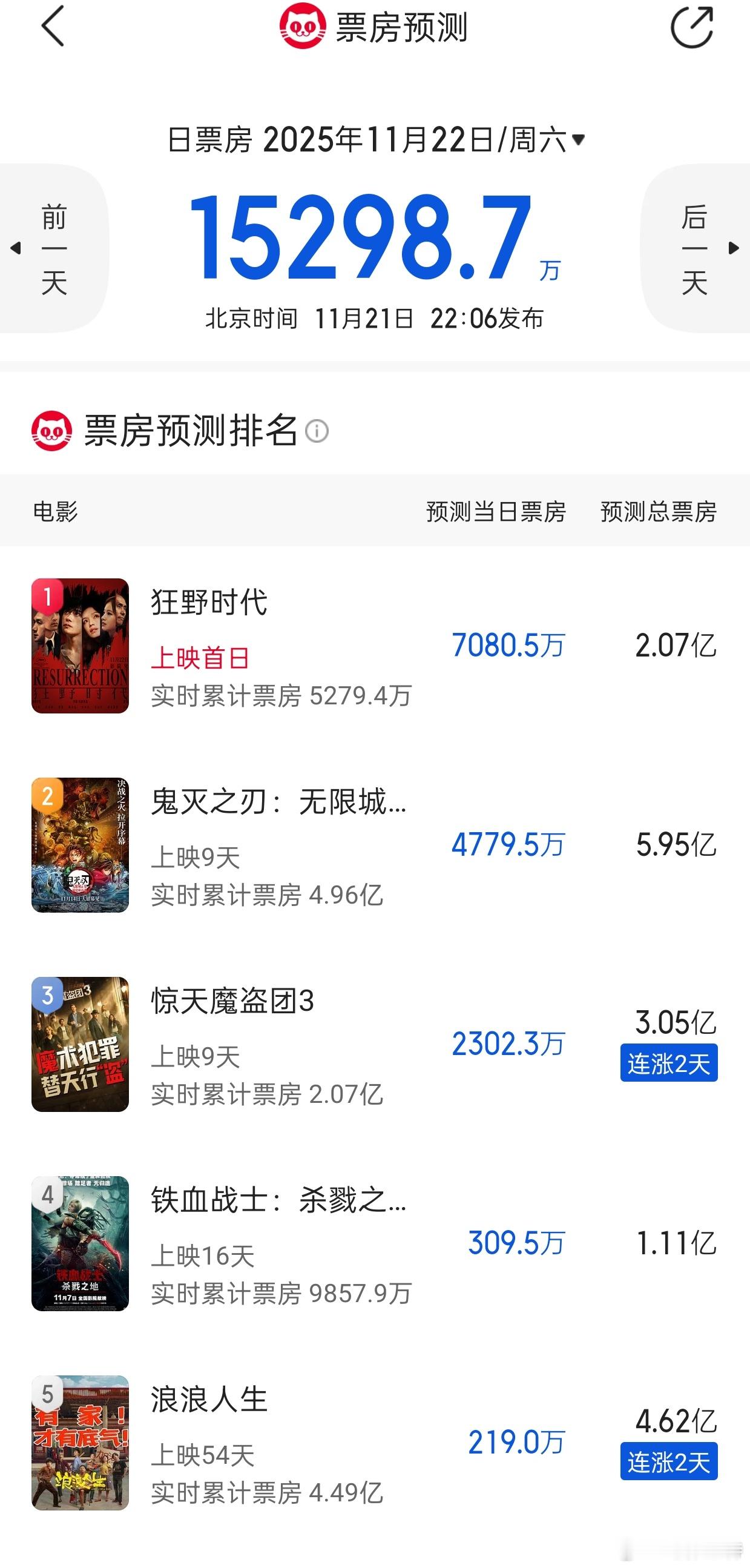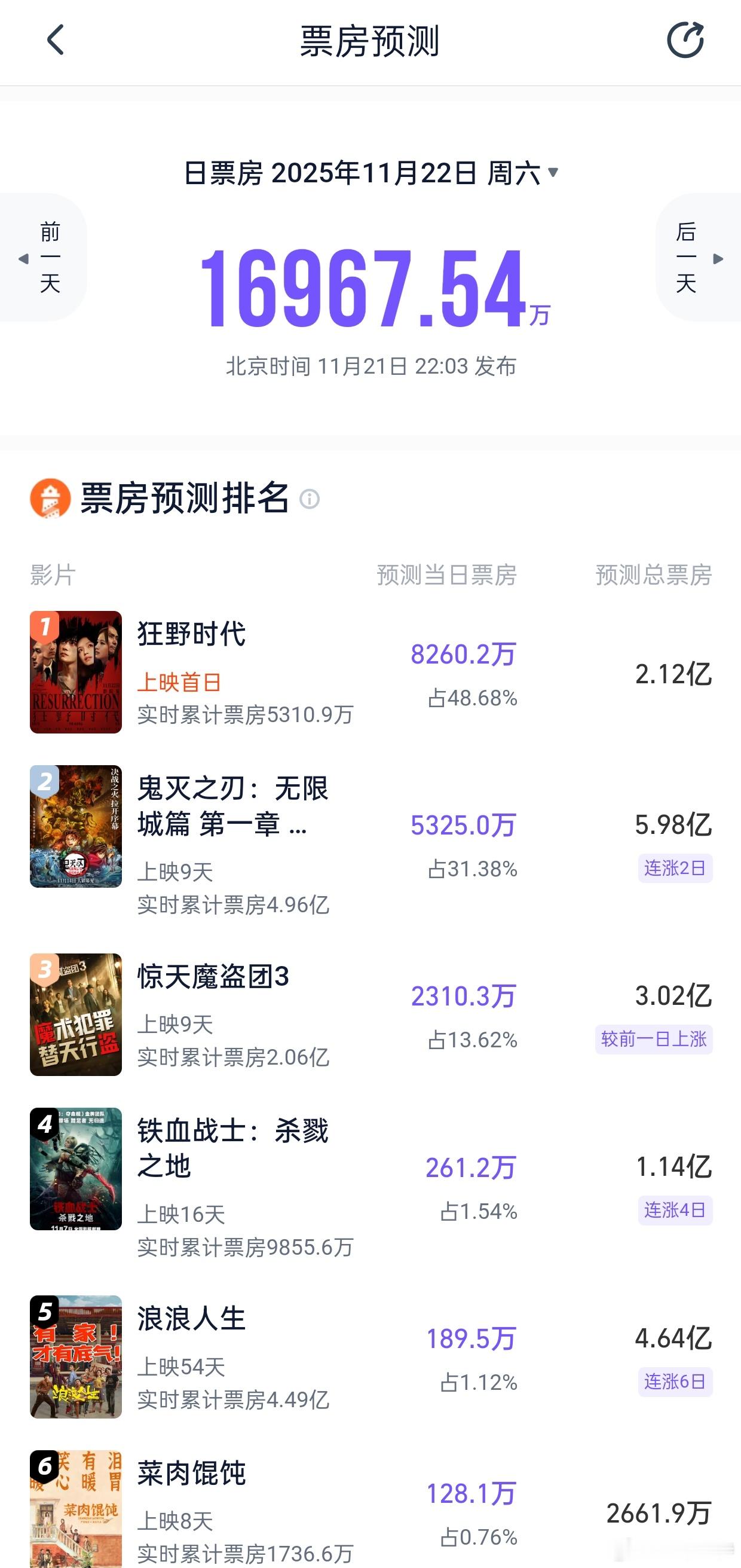 猫眼灯塔专业版预测《狂野时代》七八千万总票房2亿多。