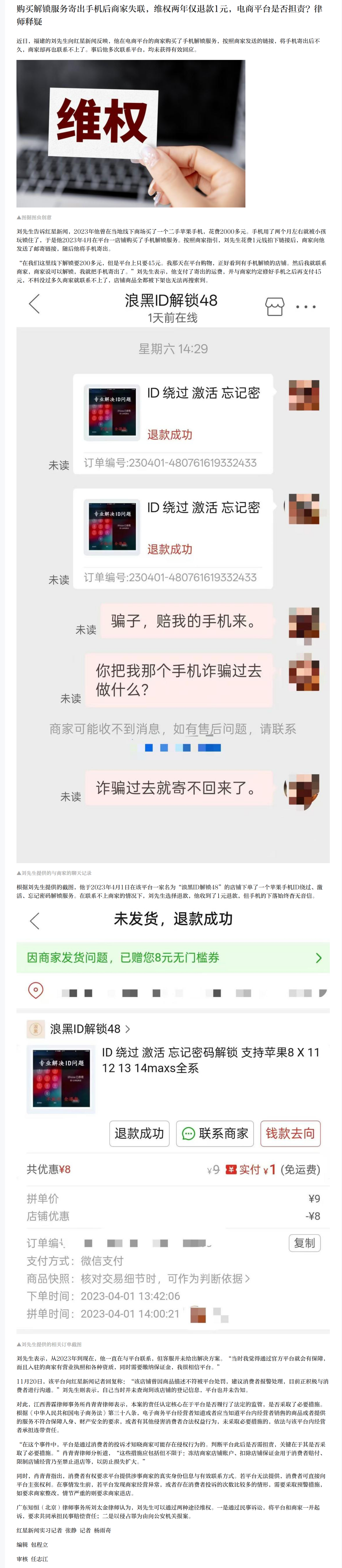 近日,福建的刘先生向红星新闻反映,他在电商平台的商家购买了手机解锁服务,按照商家发送的链接,将手机寄出后不久,商家却再也联系不上了。事后他多次联系平台,均未获得有效回应。刘先生告诉红星新闻,2023年他曾在当地线下商场买了一个二手苹果手机,花费2000多元。手机用了两个月左右就被小孩玩锁住了,于是他2023年4月在平台一店铺购买了手机解锁服务。按照商家指引,刘先生花费1元钱拍下链接后,商家向他发送了邮寄链接,随后他将手机寄出。“在我们这里线下解锁要200多元,但是平台上只要45元。我那天在平台购物,正好看到有手机解锁的店铺。然后我就联系商家,商家说可以解锁,我就把手机寄出了。”刘先生表示,他支付了寄出的运费,并与商家约定修好手机之后再支付45元,不料没过多久商家就联系不上了,店铺商品全都被下架也无法再搜索到。根据刘先生提供的截图,他于2023年4月1日在该平台一家名为“浪黑ID解锁48”的店铺下单了一个苹果手机ID绕过、激活、忘记密码解锁服务。在联系不上商家的情况下,刘先生选择退款,他收到了1元退款,但手机的下落始终杳无音信。