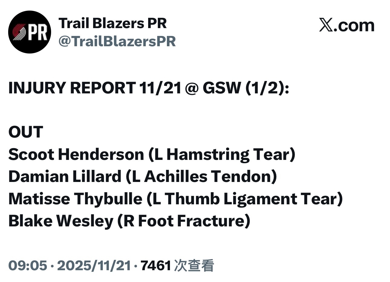 开拓者更新明天对阵湖人伤病报告:谢登·夏普(左小腿酸痛)大概率出战,斯库特·亨德