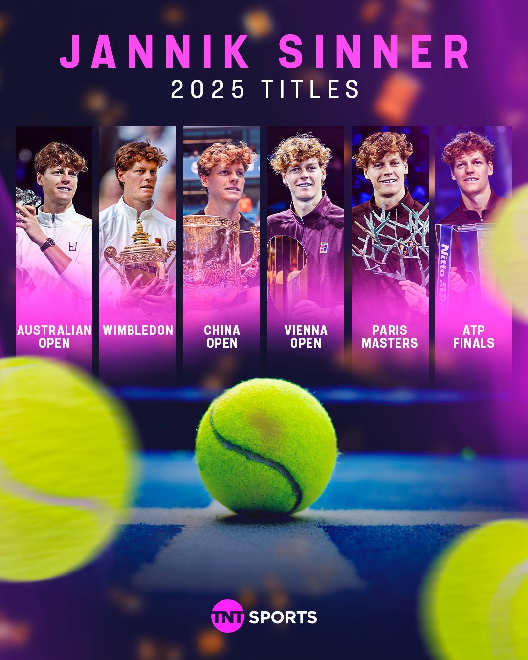 辛纳的2025赛季你们打几分?参加12项赛事10个决赛6个冠军年终第二今年58胜6负(91%)