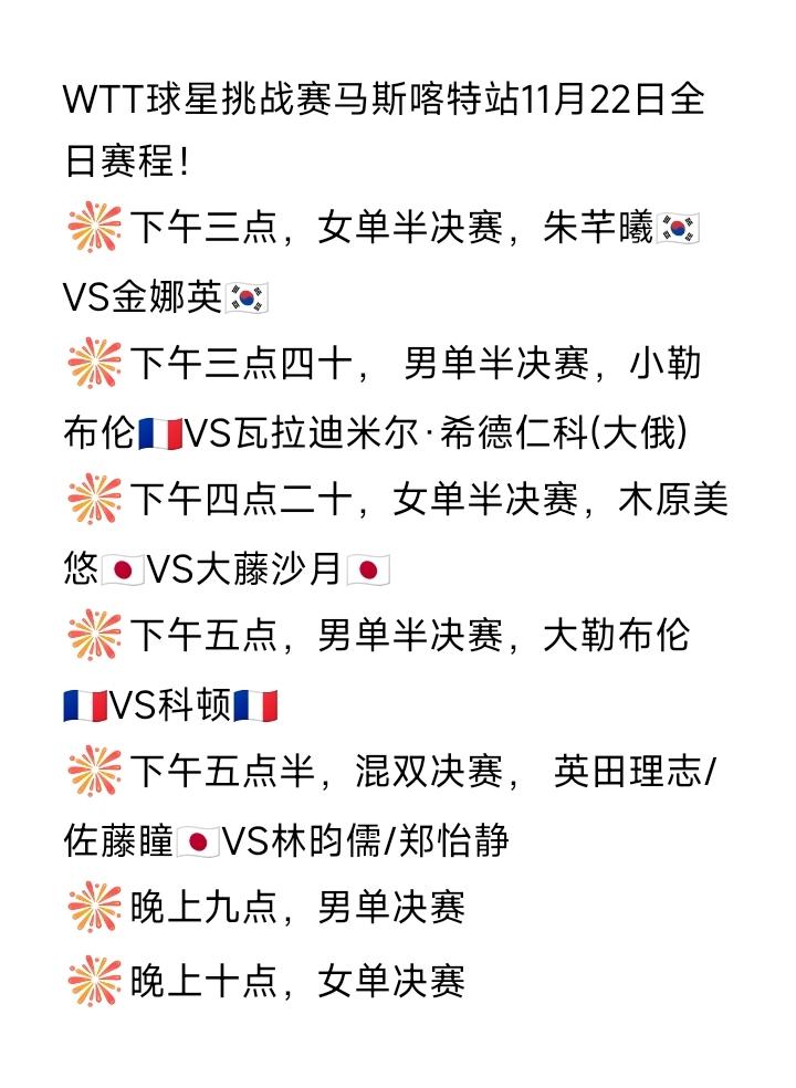 大布、小布会会师决赛吗[吃瓜群众]? 马斯喀特站今日赛程! 2025WTT球星挑战赛马斯喀特站11月22日全日赛程如图所示。 倾巢出动的法男乒也确实有实力,四强占三了,大小勒布伦能不能会师决赛是我比较好奇的[吃瓜群众]。 本站比赛张本兄妹、伊藤美诚都没有来,早田希娜早早就被李恩惠🇰🇷横扫了,无缘八强。 昨晚林昀儒0-3输给了大勒布伦,无缘半决赛,说实话林昀儒已经低迷两年了,自从2023年法兰克福冠军赛夺冠后台林连一次男单决赛都没进过,还好本站他和郑怡静的混双组合晋级了决赛,对阵日本组合,如果夺冠,混双还能搭上年终总决赛的末班车。 女单半决赛,看起来就是日韩先内战选出一个最强的,然后决赛对决[吃瓜群众]。 比赛从下午三点开始,晚上十点结束,时间很友好,咪咕视频有直播,小伙伴们一起关注哦[笑哭]。