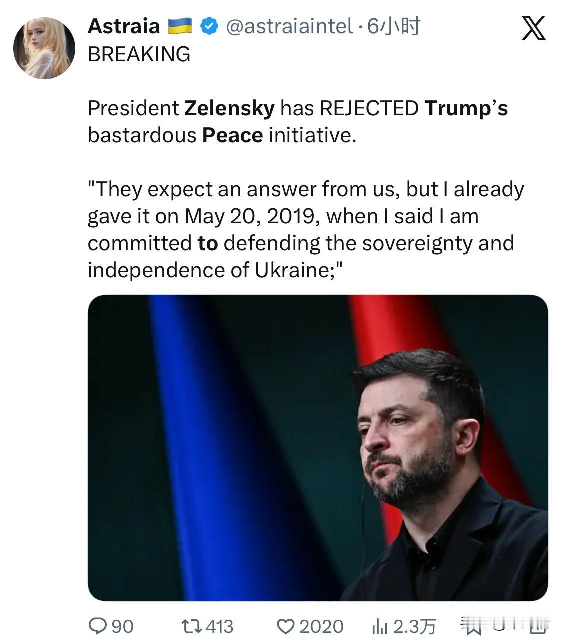 突发:泽连斯基拒绝了特朗普的和平倡议,并表示乌克兰不会接受美国提出的和平协议。他指出,早在2019年5月20日,他就公开誓言捍卫国家独立和主权,华盛顿已经得到了答案。