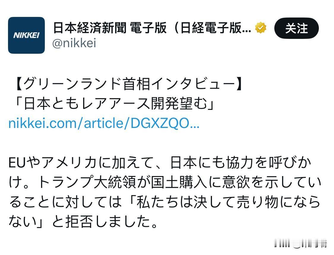 格陵兰岛总理延斯-弗雷德里克·尼尔森(Jens-Frederik Nielsen)表示:希望与日美欧共同开发稀土 就美国总统表现出希望购买格陵兰岛的意向,尼尔森表示拒绝,称「我们绝不会成为商品。现在也不会改变」。主张深化稀土开发等合作「以双方尊重为前提。还表示没打算和中国合作……