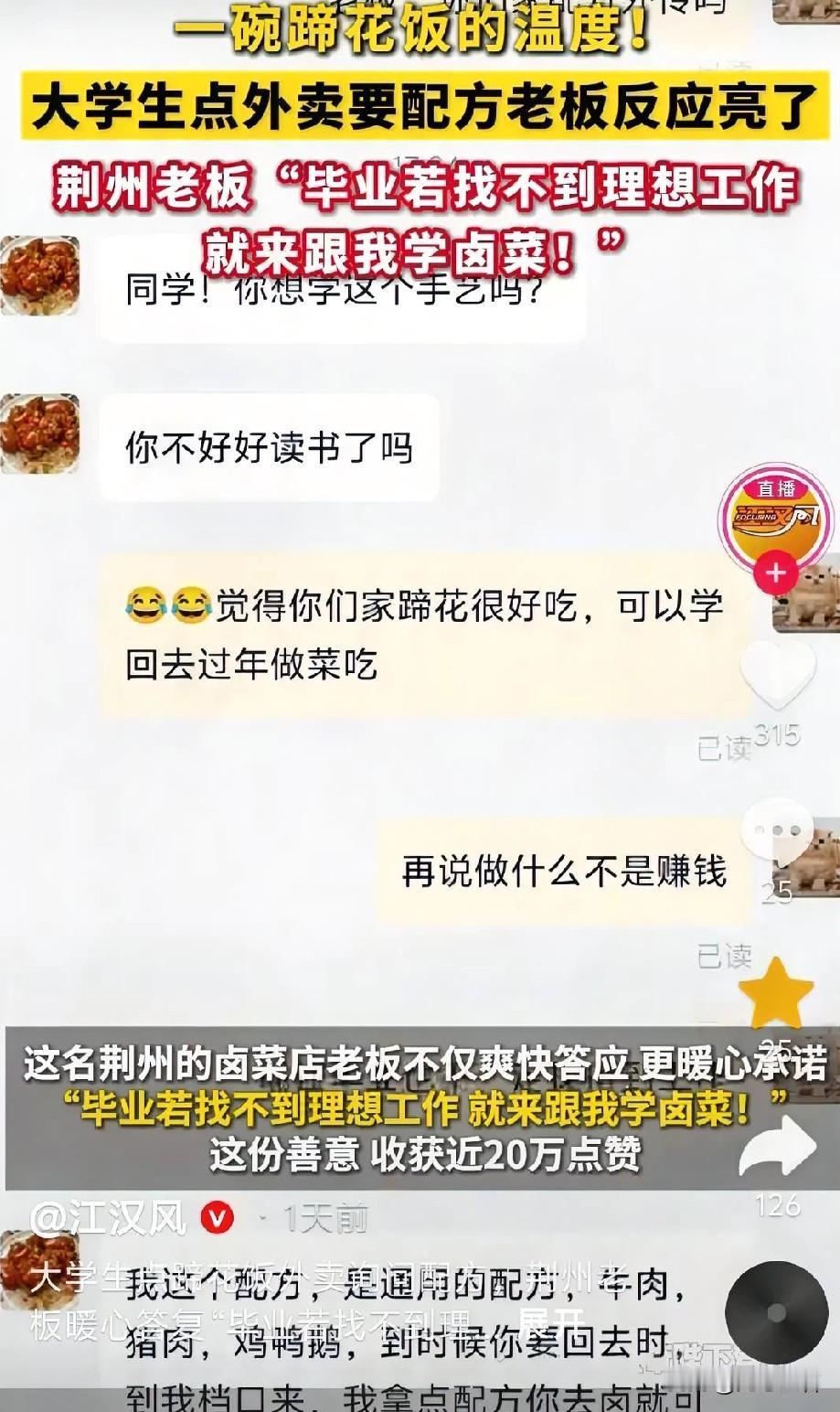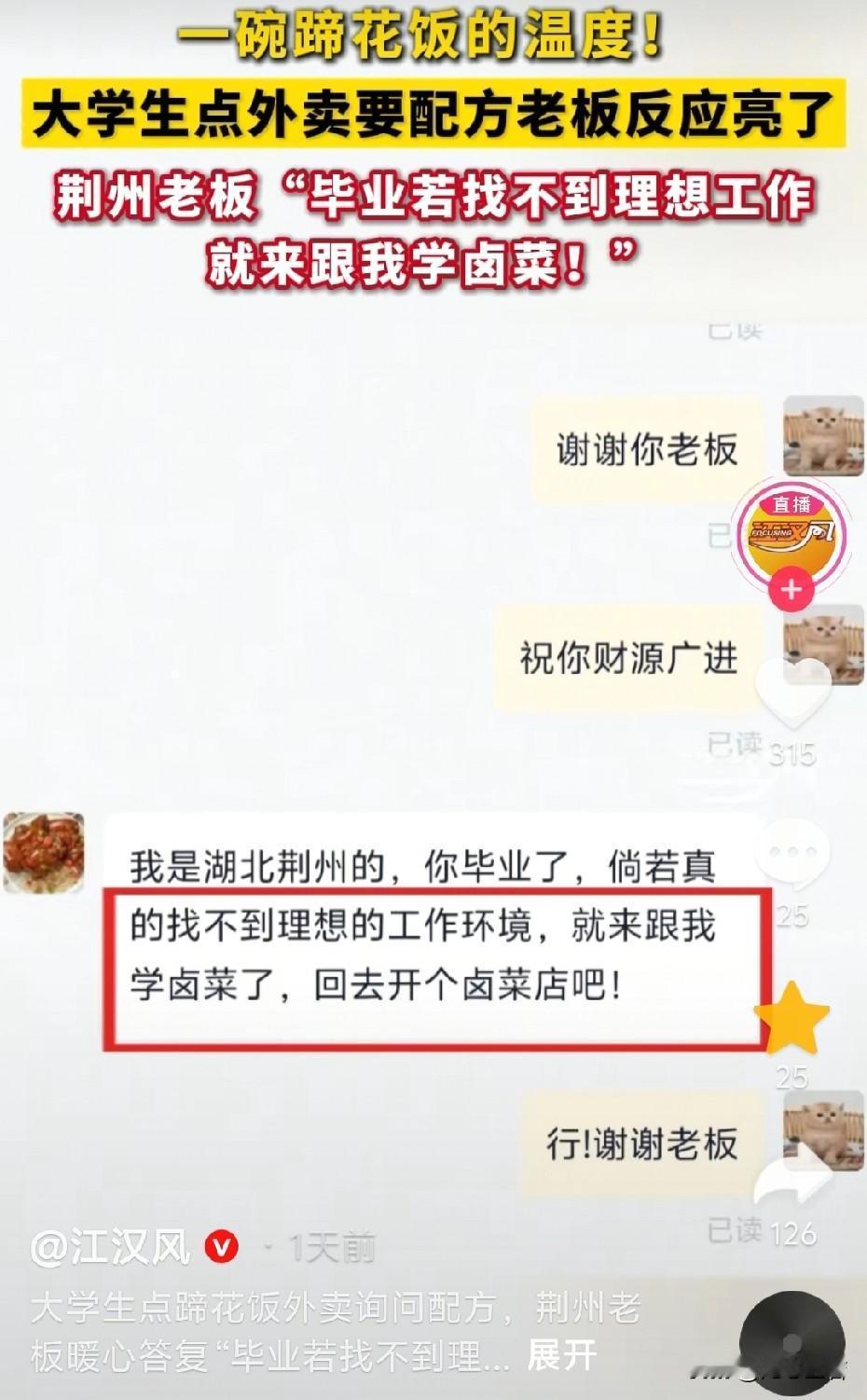 11月19日,湖北宜昌,一名大学生点了一份蹄花饭,感觉比家里做的好吃,就问老板:“你们家配方外传吗?” 老板没有直接回答他的问题,而是反问道:“同学,你想学这个手艺吗?你不好好读书了吗?” 这名大学生笑了,不好意思地解释道:“觉得你们家蹄花很好吃,打算学会了,过年回家做菜吃。再说了,干什么不是赚钱?现在毕业也不一定找得到工作。” 老板释然了,耐心地介绍说:“我这个配方,是通用的配方,牛肉、猪肉、鸡鸭鹅,到时候你要回去时,到我档口来,我拿点配方你去卤就可以了,学我这个很辛苦的。” 老板又追问道:“你老家哪里的?”大学生回答说:“我老家湖北鄂州的,谢谢你老板,祝您财源广进!” 老板爽快地回答道:“我是湖北荆州的,你毕业了,倘若真找不到理想的工作岗位,就来跟我学卤菜,回去开个卤菜店吧!” 小伙子表示,自己是一名大四的学生,晚上吃晚饭的时候,在学校里面点了一份外卖,感觉他家的蹄花饭非常好吃,就想着学会了,回家过年做给家里人吃,我就抱着试一下的心理,没想到,老板给我说了这些话,让我觉得挺感动的 看了视频,这事儿听着就挺暖的,像冬日里喝了一碗热汤。 大学生只是真心喜欢那口味道,鼓起勇气要配方,本身就带着年轻人的天真和真诚,没想着能成,结果老板不仅没拒绝,还给了这么大的善意,这种不带功利的温暖,在现在挺难得的。 老板说“找不到理想工作就来跟我学卤菜”,不是随便客套,是真把这孩子的难处放在了心上,知道刚毕业的学生容易迷茫,愿意给个兜底的路,这种体谅比给配方更让人感动。 其实生活里不缺这样的小善意,有人会在你手足无措的时候拉一把,这种来自陌生人的温暖,能让你觉得这个世界没那么冷,也会想着以后自己也要这样对别人。(来源:江汉风)