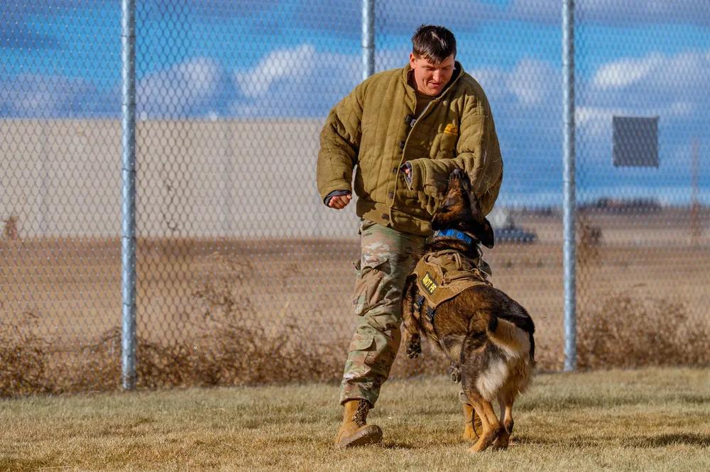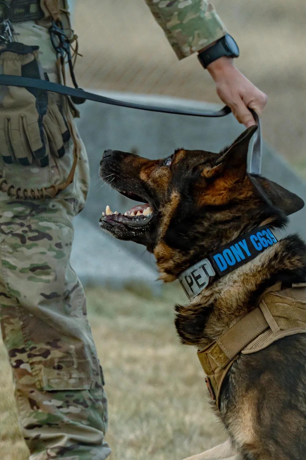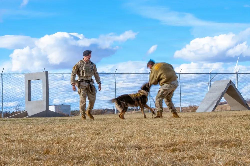 至今为止,美军还是没有放弃军犬的训练 2025年11月19日,在怀俄明州F.E.沃伦空军基地的演示中,第90安全部队中队的军用警犬多尼进行训练。第90安全部队军用警犬单位负责管理、照顾和训练用于毒品和爆炸物探测的军用警犬。